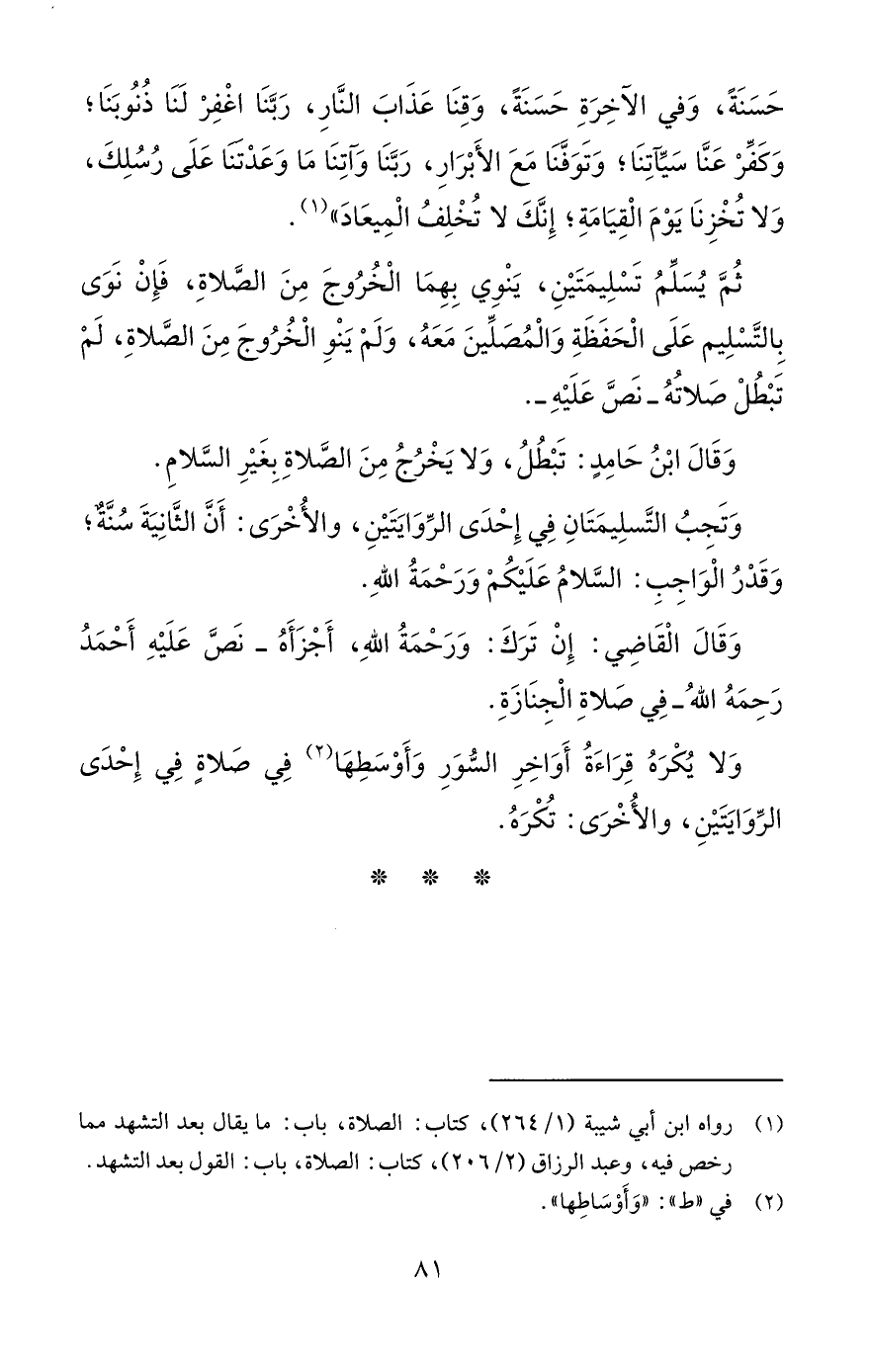 وَتَجِبُ التَّسلِيمَتَانِ فِي إِحْدَى الرِّوَايَتَيْنِ، والأُخْرَى: أَنَّ الثَّانِيَةَ سُنَّةٌ؛ وَقَدْرُ الْوَاجِبِ: السَّلامُ عَلَيْكُمْ وَرَحْمَةُ اللهِ.