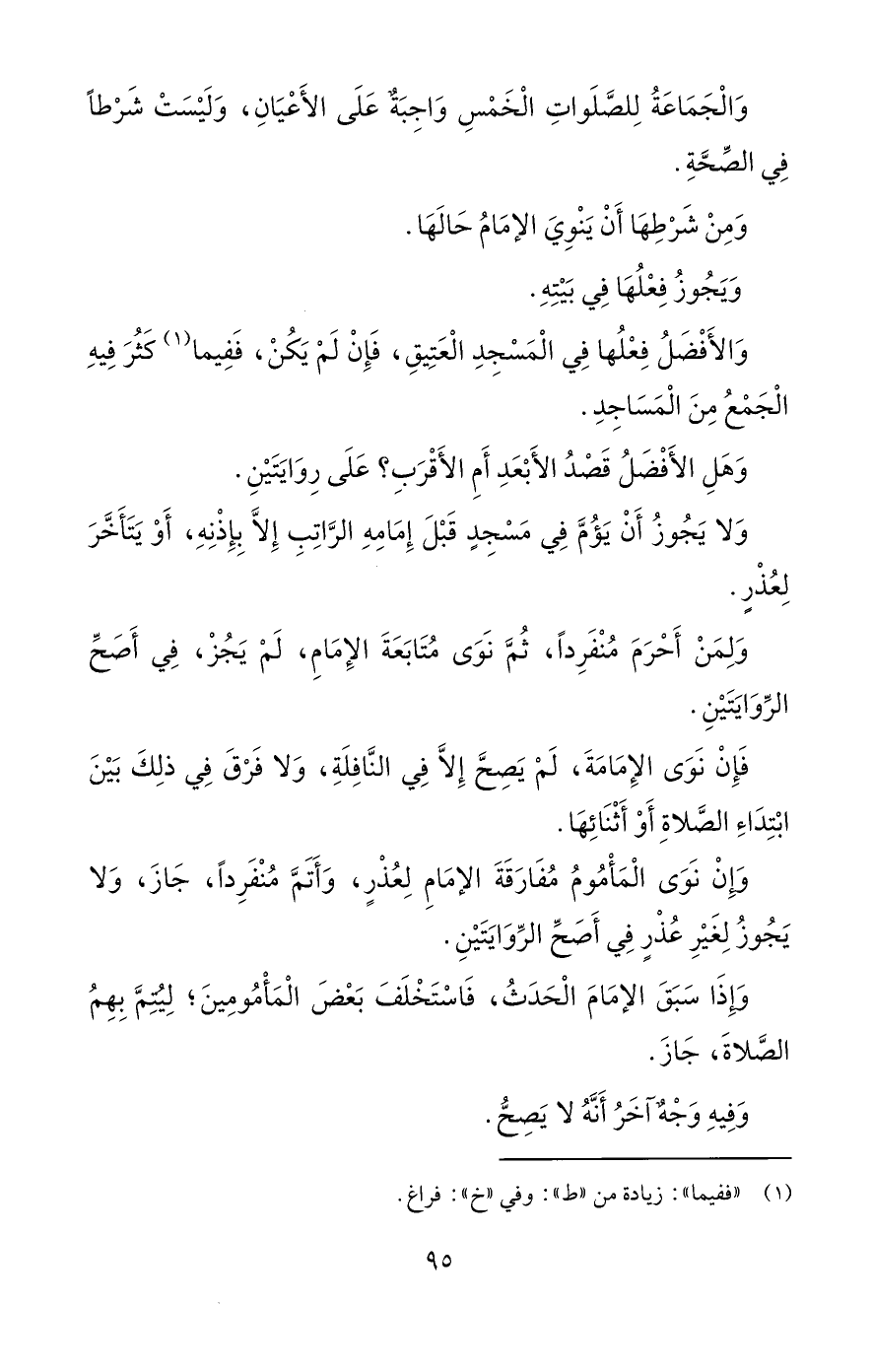 وَالْجَمَاعَةُ لِلصَّلَواتِ الْخَمْسِ وَاجِبَةٌ عَلَى الأَعْيَانِ، وَلَيْسَتْ شَرْطاً فِي الصِّحَّةِ.