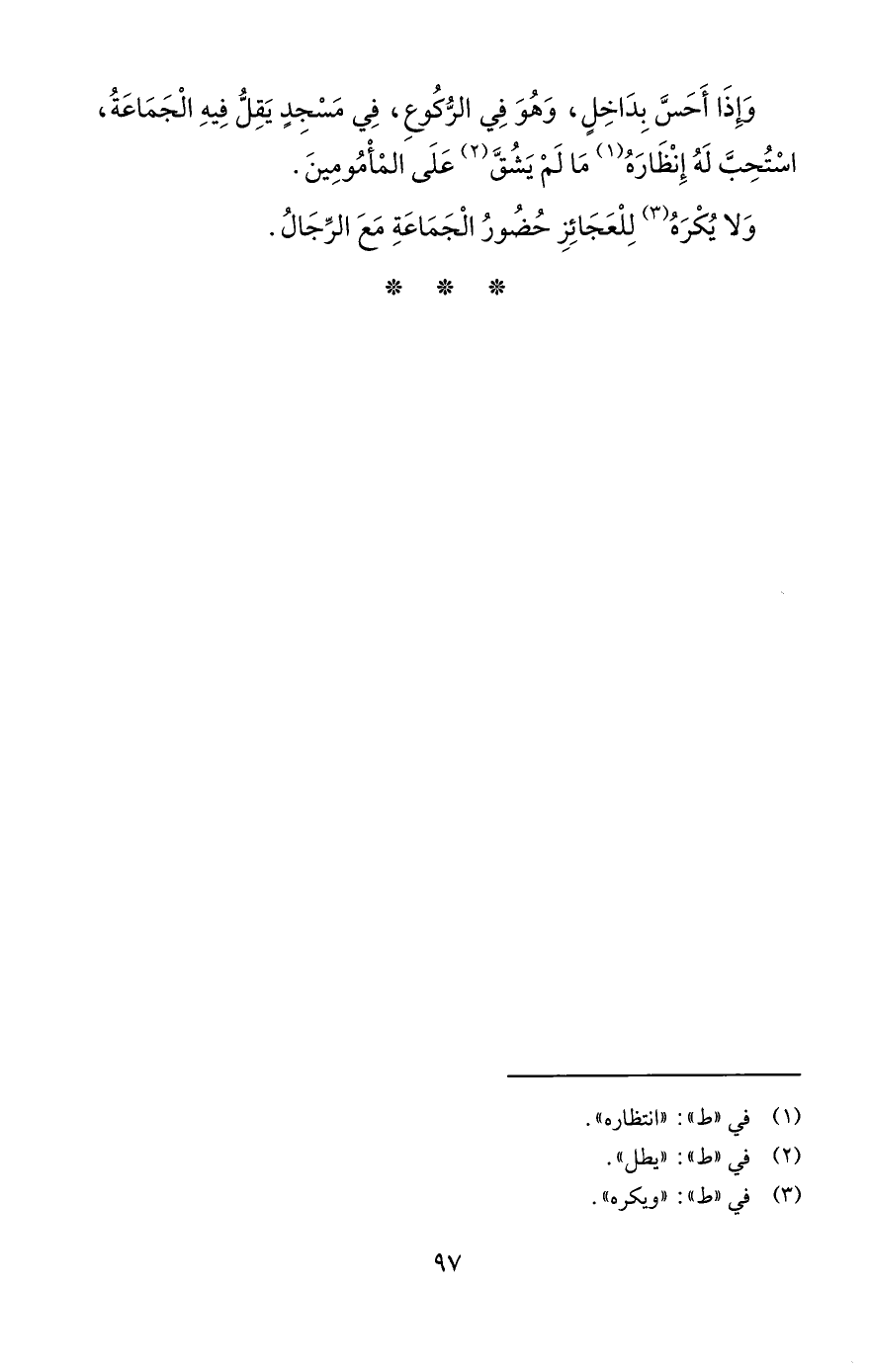 وَإِذَا أَحَسَّ بِدَاخِلى، وَهُوَ فِي الرُّكُوعِ، فِي مَسْجِدٍ يَقِلُّ فِيهِ الْجَمَاعَةُ، اسْتُحِبَّ لَهُ إِنْظَارَهُ (¬1) مَا لَمْ يَشُقَّ (¬2) عَلَى المْأْمُومِينَ.