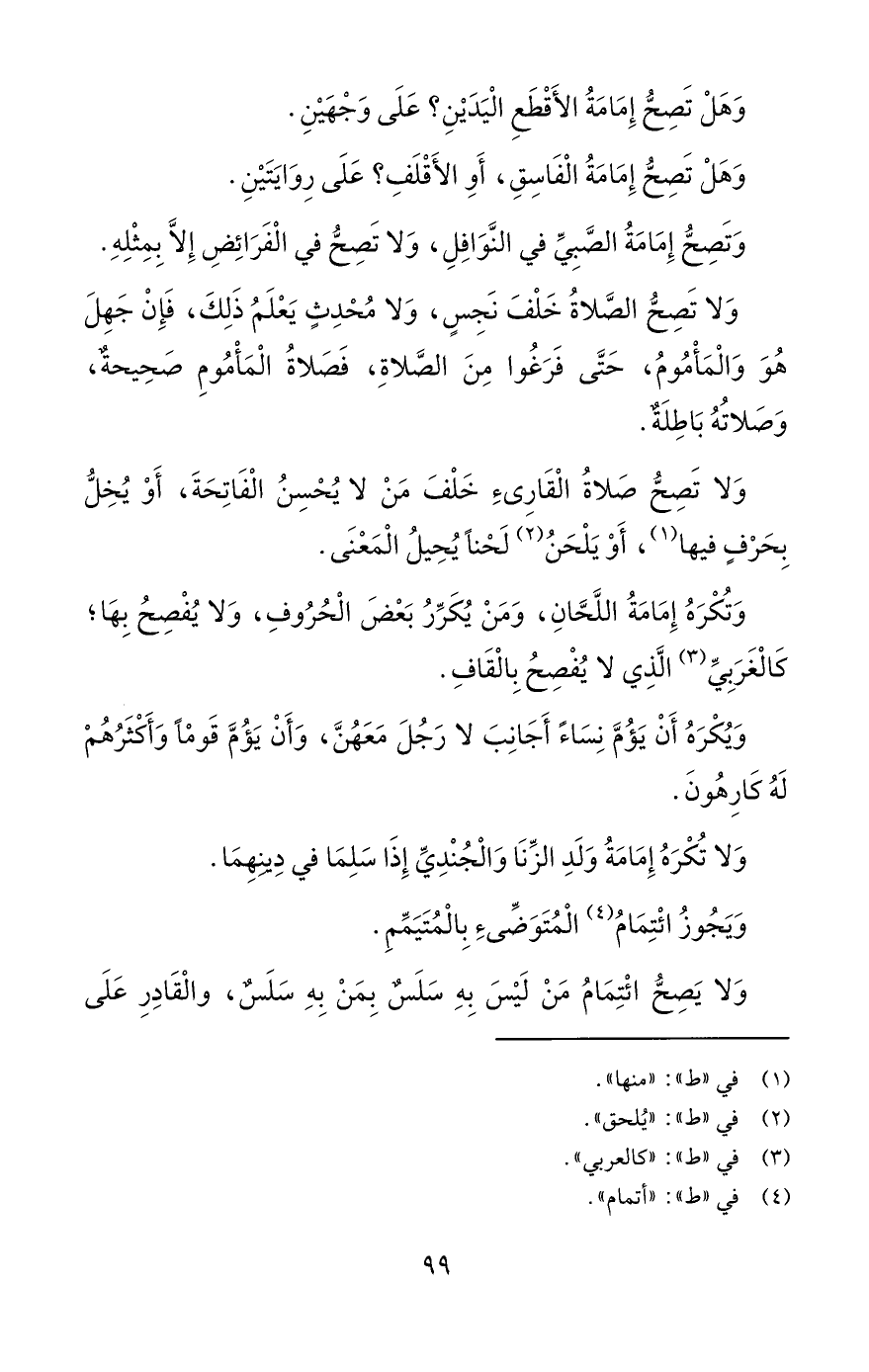 وَلا تَصِحُّ صَلاةُ الْقَارِئِ خَلْفَ مَنْ لا يُحْسِنُ الْفَاتِحَةَ، أَوْ يُخِلُّ بِحَرْفٍ فيها (¬1)، أَوْ يَلْحَنُ (¬2) لَحْناً يُحِيلُ الْمَعْنَى.