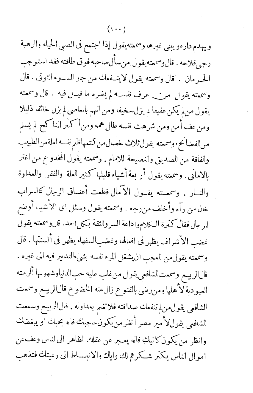 وَيَهْدِمُ دَارِهِ وَيَبْنِي غَيْرَهَا وَسَمِعْتُهُ يَقُولُ إِذَا اجْتَمَعَ فِي الصَّبِيِّ الْحَيَاءُ وَالرَّهْبَةُ رُجِيَ فَلاحُهُ قَالَ وَسَمِعْتُهُ يَقُولُ مَنْ سَأَلَ صَاحِبَهُ فَوْقَ طَاقَتِهِ فَقَدِ اسْتَوْجَبَ الْحِرْمَانَ قَالَ وَسَمِعْتُهُ يَقُولُ لَا يَنْفَعُك مِنْ جَارِ السُّوءِ التَّوَقِّي قَالَ وَسَمِعْتُهُ يَقُولُ مَنْ عَرَفَ نَفْسَهُ لَمْ يَضُرَّهُ مَا قيل فِيهِ قَالَ وَسَمِعْتُهُ يَقُولُ مَنْ لَمْ يَكُنْ عَفِيفًا لَمْ يَزَلْ سَخِيفًا وَمَنِ اتُّهِمَ بِالْمَعَاصِي لَمْ يَزَلْ خَائِفًا ذَلِيلا وَمَنْ عَفَّ أَمِنَ وَمَنْ شَرِهَتْ نَفْسُهُ طَالَ هَمُّهُ وَمَنْ أَكْثَرَ الْمَنَاكِحِ لم يسلم من الفضائح وَسَمِعْتُهُ يَقُولُ ثَلاثُ خِصَالٍ مَنْ كَتَمَهَا ظَلَمَ نَفْسَهُ الْعِلَّةُ مِنَ الطَّبِيبِ وَالْفَاقَةُ مِنَ الصَّدِيقِ وَالنَّصِيحَةُ لِلإِمَامِ وَسَمِعْتُهُ يَقُولُ الْمَخْدُوعُ مَنِ اغْتَرَّ بِالأَمَانِيِّ وَسَمِعْتُهُ يَقُولُ أَرْبَعَةُ أَشْيَاءَ قَلِيلُهَا كَثِيرٌ الْعِلَّةُ وَالْفَقْرُ وَالْعَدَاوَةُ وَالنَّارُ وَسَمِعْتُهُ يَقُولُ الآمَالُ قَطَعَتْ أَعْنَاقَ الرِّجَالِ كَالسَّرَابِ خَانَ مَنْ رَآهُ وَأَخْلَفَ مَنْ رَجَاهُ وَسَمِعْتُهُ يَقُولُ وَسُئِلَ أَيُّ الأَشْيَاءِ أَوْضَعُ لِلرِّجَالِ فَقَالَ كَثْرَةُ الْكَلامِ وَإِذَاعَةُ السِّرِّ وَالثِّقَةُ بِكُلِّ أَحَدٍ قَالَ وَسَمِعْتُهُ يَقُولُ غَضَبُ الأَشْرَافِ يَظْهَرُ فِي أَفْعَالِهَا وَغَضَبُ السُّفَهَاءِ يَظْهَرُ فِي أَلْسِنَتِهَا قَالَ وَسَمِعْتُهُ يَقُولُ مِنَ الْعجب ان يشغل الْمَرْء نَفسه بشئ التَّدْبِيرُ فِيهِ إِلَى غَيْرِهِ قَالَ الرَّبِيعُ وَسَمِعْتُ الشَّافِعِيَّ يَقُولُ مَنْ غَلَبَ عَلَيْهِ حُبُّ الدُّنْيَا وَشَهْوَتُهَا أَلْزَمَتْهُ الْعُبُودِيَّةَ لأَهْلِهَا وَمَنْ رَضِيَ بِالْقَنُوعِ زَالَ عَنْهُ الْخُضُوعُ قَالَ الرَّبِيعُ وَسَمِعْتُ الشَّافِعِيَّ يَقُول من لم تنفعك صداقته فَلَا تغنم بعداوته قَالَ الرّبيع وَسمعت الشَّافِعِي يَقُول أَمِير مصر أنظر من يكون حاجبك فانه يحبك أَوْ يَبَغْضُكَ وَانْظُرْ مَنْ يَكُونَ كَاتِبَكَ فَإِنَّهُ يُعَبِّرُ عَنْ عَقْلِكَ الظَّاهِرِ إِلَى النَّاسِ وَعِفَّ عَنْ أَمْوَالِ النَّاسِ يَكْثُرُ شُكْرُهُمْ لَكَ وَإِيَّاكَ وَالانْبِسَاطَ إِلَى رَعِيَّتِكَ فَتُذْهِبُ