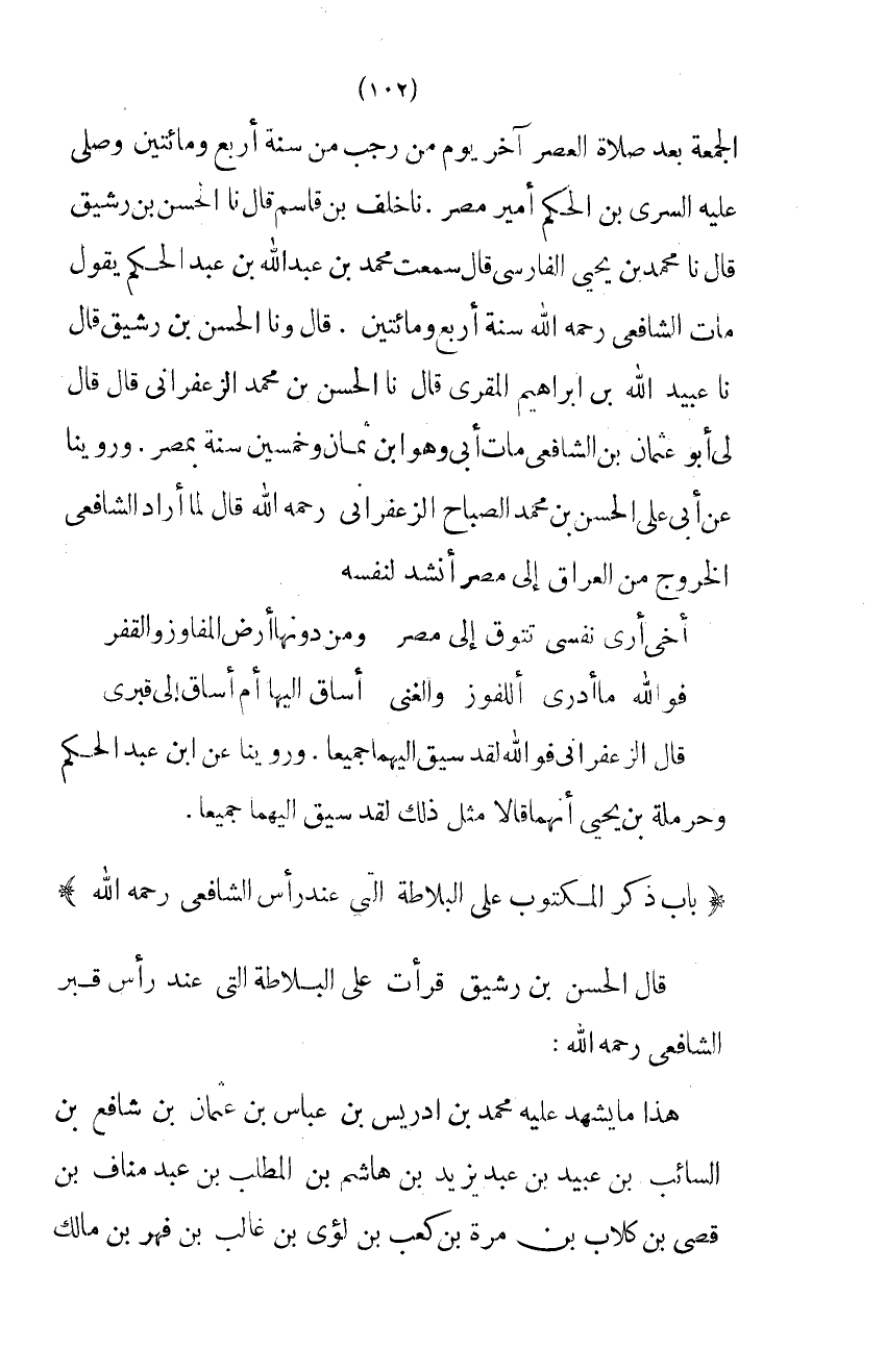 الْجُمُعَةِ بَعْدَ صَلاةِ الْعَصْرِ آخِرَ يَوْمٍ مِنْ رَجَبٍ مِنْ سَنَةِ أَرْبَعٍ وَمِائَتَيْنِ وَصَلَّى عَلَيْهِ السَّرِيُّ بْنُ الْحَكَمِ أَمِيرُ مِصْرَ نَا خَلَفُ بْنُ قَاسِمٍ قَالَ نَا الْحَسَنُ بْنُ رَشِيقٍ قَالَ نَا مُحَمَّدُ بْنُ يَحْيَى الْفَارِسِيُّ قَالَ سَمِعت مُحَمَّد بن عبد الله بن عبد الحكم يَقُولُ مَاتَ الشَّافِعِيُّ رَحِمَهُ اللَّهُ سَنَةَ أَرْبَعٍ وَمِائَتَيْنِ قَالَ وَنا الْحَسَنُ بْنُ رَشِيقٍ قَالَ نَا عبيد الله بن ابراهيم المقرى قَالَ نَا الْحَسَنُ بْنُ مُحَمَّدٍ الزَّعْفَرَانِيُّ قَالَ قَالَ لِي أَبُو عُثْمَانَ بْنُ الشَّافِعِيِّ مَاتَ أَبِي وَهُوَ ابْنُ ثَمَانٍ وَخَمْسِينَ سَنَةً بِمِصْرَ وَرُوِّينَا عَنْ أَبِي عَلِيٍّ الْحَسَنِ بْنِ مُحَمَّدِ الصَّباح الزعفرانى رَحمَه الله قَالَ لَمَّا أَرَادَ الشَّافِعِيُّ الْخُرُوجَ مِنَ الْعِرَاقِ إِلَى مصر أنْشد لِنَفْسِهِ