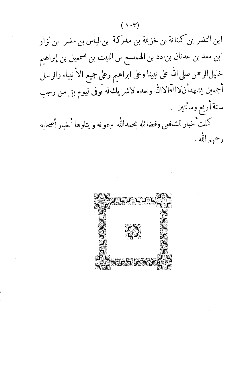 كَمُلَتْ أَخْبَارُ الشَّافِعِيِّ وَفَضَائِلُهُ بِحَمْدِ اللَّهِ وَعَوْنِهِ وَيَتْلُوهَا أَخْبَارُ أَصْحَابِهِ رَحِمَهُمُ اللَّهُ