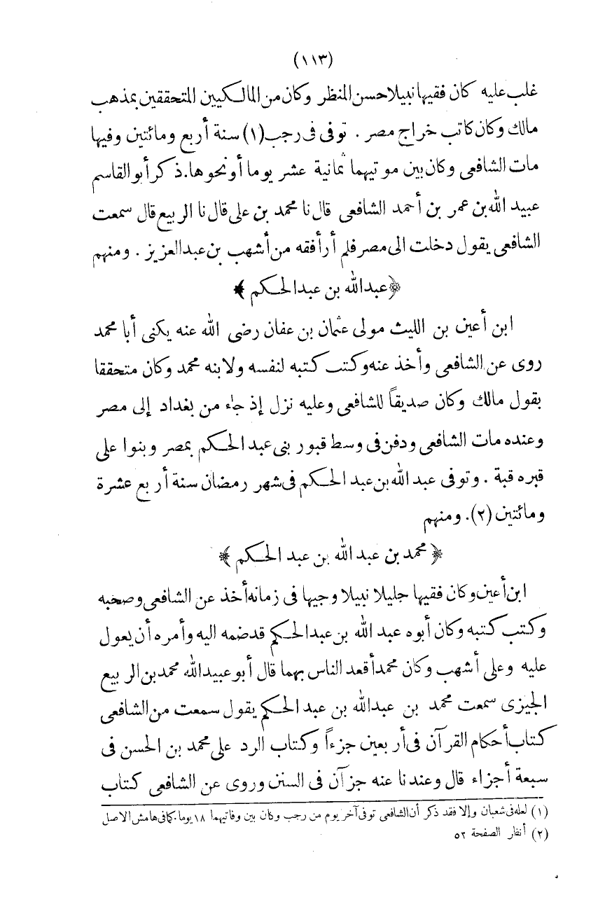 ابْن أَعْيَنَ بْنِ اللَّيْثِ مَوْلَى عُثْمَانَ بْنِ عَفَّانَ رَضِيَ اللَّهُ عَنْهُ يُكَنَّى أَبَا مُحَمَّدٍ رَوَى عَنِ الشَّافِعِيِّ وَأَخَذَ عَنْهُ وَكَتَبَ كُتُبَهُ لِنَفْسِهِ وَلابْنِهِ مُحَمَّدٍ وَكَانَ مُتَحَقِّقًا بِقَوْلِ مَالِكٍ وَكَانَ صَدِيقًا لِلشَّافِعِيِّ وَعَلَيْهِ نَزَلَ إِذْ جَاءَ مِنْ بَغْدَادَ إِلَى مِصْرَ وَعِنْدَهُ مَاتَ الشَّافِعِيُّ وَدُفِنَ فِي وَسَطِ قُبُورِ بَنِي عَبْدِ الْحَكِم بِمِصْرَ وَبَنَوْا عَلَى قَبْرِهِ قُبَّةً وَتُوُفِّيَ عَبْدُ اللَّهِ بْنُ عَبْدِ الْحَكَمِ فِي شَهْرِ رَمَضَانَ سَنَةَ أَربع عشرَة وَمِائَتَيْنِ وَمِنْهُم