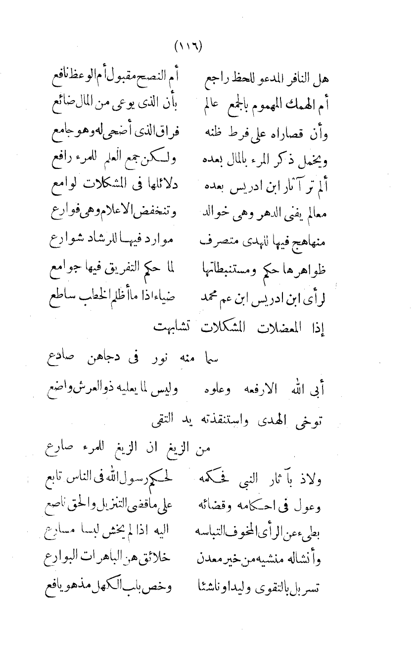 (أَلَمْ تَرَ آثَارَ ابْنِ إِدْرِيسَ بَعْدَهُ ... دَلائِلُهَا فِي الْمُشْكِلاتِ لَوَامِعُ)