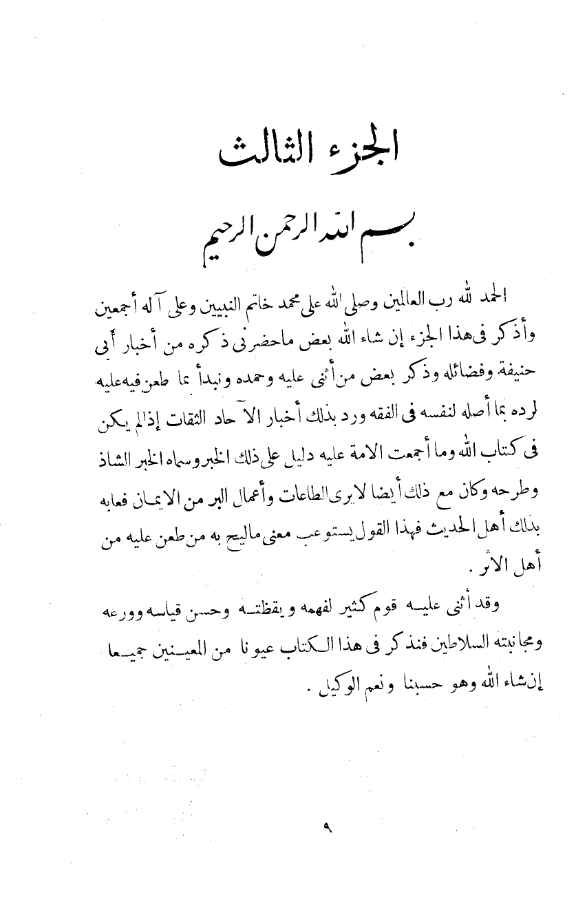 الْحَمْدُ لِلَّهِ رَبِّ الْعَالَمِينَ وَصَلَّى اللَّهُ عَلَى مُحَمَّدٍ خَاتَمِ النَّبِيِّينَ وَعَلَى آلِهِ أَجْمَعِينَ وَأَذْكُرُ فِي هَذَا الْجُزْءِ إِنْ شَاءَ اللَّهُ بَعْضَ مَا حَضَرَنِي ذِكْرُهُ مِنْ أَخْبَارِ أَبِي حَنِيفَةَ وَفَضَائِلِهِ وَذِكْرِ بَعْضِ من أثنى عَلَيْهِ وحمده ونبدأ بِمَا طُعِنَ فِيهِ عَلَيْهِ لِرَدِّهِ بِمَا أَصَّلَهُ لِنَفْسِهِ فى الْفِقْه ورد بذلك أَخْبَارِ الآحَادِ الثِّقَاتِ إِذَا لَمْ يَكُنْ فِي كتاب الله وَمَا أَجْمَعَتِ الأُمَّةُ عَلَيْهِ دَلِيلٌ عَلَى ذَلِكَ الْخَبَرِ وَسَمَّاهُ الْخَبَرَ الشَّاذَّ وَطَرَحَهُ وَكَانَ مَعَ ذَلِكَ أَيْضًا لَا يَرَى الطَّاعَاتِ وَأَعْمَالَ الْبِرِّ مِنَ الإِيمَانِ فَعَابَهُ بِذَلِكَ أَهْلُ الْحَدِيثِ فَهَذَا الْقَوْلُ يستوعب معنى ماليح بِهِ مَنْ طَعَنَ عَلَيْهِ مِنْ أَهْلِ الأَثَرِ