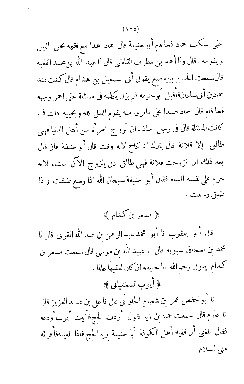حَتَّى سَكَتَ حَمَّادٌ فَلَمَّا قَامَ أَبُو حَنِيفَةَ قَالَ حَمَّادٌ هَذَا مَعَ فِقْهِهِ يُحْيِي اللَّيْلَ وَيَقُومُهُ قَالَ وَنا أَحْمَدُ بْنُ مُطَرِّفٍ الْقَاضِي قَالَ نَا عبد الله بْنُ مُحَمَّدٍ الْفَقِيهُ قَالَ سَمِعْتُ الْحَسَنَ بْنَ مُطِيع يَقُول أَنى اسمعيل بْنُ هِشَامٍ قَالَ كُنْتُ عِنْدَ حَمَّادِ بْنِ أَبِي سُلَيْمَانَ فَأَقْبَلَ أَبُو حَنِيفَةَ فَلَمْ يَزَلْ يكلمهُ فى مسئلة حَتَّى احْمَرَّ وَجْهُهُ فَلَمَّا قَامَ قَالَ حَمَّادٌ هَذَا عَلَى مَا تَرَى مِنْهُ يَقُومُ اللَّيْلَ كُله ويحييه قلت فَمَا كَانَت المسئلة قَالَ فِي رَجُلٍ حَلَفَ إِنْ تَزَوَّجَ امْرَأَةً مِنْ أَهْلِ الدُّنْيَا فَهِيَ طَالِقٌ إِلا فُلانَةَ قَالَ يَتْرُكُ النِّكَاحَ لأَنَّهُ وَقَّتَ قَالَ أَبُو حَنِيفَةَ فَإِنْ قَالَ بَعْدَ ذَلِكَ إِنْ تَزَوَّجْتُ فُلانَةَ فَهِيَ طَالِقٌ قَالَ يَتَزَوَّجُ الآنَ مَا شَاءَ لأَنَّهُ حَرَّمَ عَلَى نَفْسِهِ النِّسَاءَ فَقَالَ أَبُو حَنِيفَةَ سُبْحَانَ اللَّهِ إِذَا وَسَّعَ ضَيَّقْتَ وَإِذَا ضَيَّقَ وَسَّعْتَ