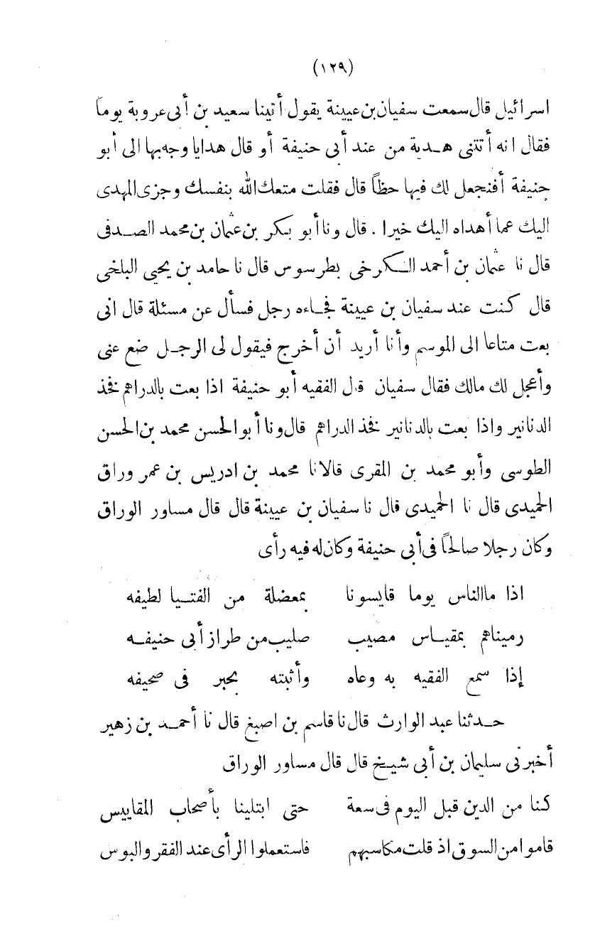 إِسْرَائِيلَ قَالَ سَمِعْتُ سُفْيَانَ بْنَ عُيَيْنَةَ يَقُولُ أَتَيْنَا سَعِيدَ بْنَ أَبِي عَرُوبَةَ يَوْمًا فَقَالَ إِنَّهُ أَتَتْنِي هَدِيَّةٌ مِنْ عِنْدِ أَبِي حَنِيفَةَ أَوْ قَالَ هَدَايَا وَجَّهَ بِهَا إِلَيَّ أَبُو حَنِيفَةَ أَفَنَجْعَلُ لَكَ فِيهَا حَظًّا قَالَ فَقُلْتُ مَتَّعَكَ اللَّهُ بِنَفْسِكَ وَجَزَى الْمَهْدِيَّ إِلَيْكَ عَمَّا أَهْدَاهُ إِلَيْكَ خَيْرًا قَالَ وَنا أَبُو بَكْرِ بْنُ عُثْمَانَ بْنِ مُحَمَّدٍ الصَّدَفِيُّ قَالَ نَا عُثْمَانُ بْنُ أَحْمَدَ الْكَرْخِيُّ بِطَرَسُوسِ قَالَ نَا حَامِدُ بْنُ يَحْيَى الْبَلْخِيُّ قَالَ كُنْتُ عِنْدَ سُفْيَانَ بْنِ عُيَيْنَةَ فَجَاءَهُ رَجُلٌ فَسَأَلَ عَنْ مسئلة قَالَ إِنِّي بِعْتُ مَتَاعًا إِلَى الْمَوْسِمِ وَأَنَا أُرِيدُ أَن أَخْرُجَ فَيَقُولُ لِي الرَّجُلُ ضَعْ عَنى وَأعجل لَك مَالك فَقَالَ سُفْيَانُ قَالَ الْفَقِيهُ أَبُو حَنِيفَةَ إِذَا بِعْتَ بِالدَّرَاهِمِ فَخُذِ الدَّنَانِيرَ وَإِذَا بِعْتَ بِالدَّنَانِيرِ فَخُذِ الدَّرَاهِمَ قَالَ وَنا أَبُو الْحَسَنِ مُحَمَّدُ بن الْحسن الطوسى وَأَبُو مُحَمَّد بن المقرى قَالا نَا مُحَمَّدُ بْنُ إِدْرِيسَ بْنِ عُمَرَ وَرَّاقُ الْحُمَيْدِيِّ قَالَ نَا الْحُمَيْدِيُّ قَالَ نَا سُفْيَان بن عُيَيْنَة قَالَ قَالَ مُسَاوِرٌ الْوَرَّاقُ وَكَانَ رَجُلا صَالِحًا فِي أَبِي حَنِيفَةَ وَكَانَ لَهُ فِيهِ رَأْيٌ