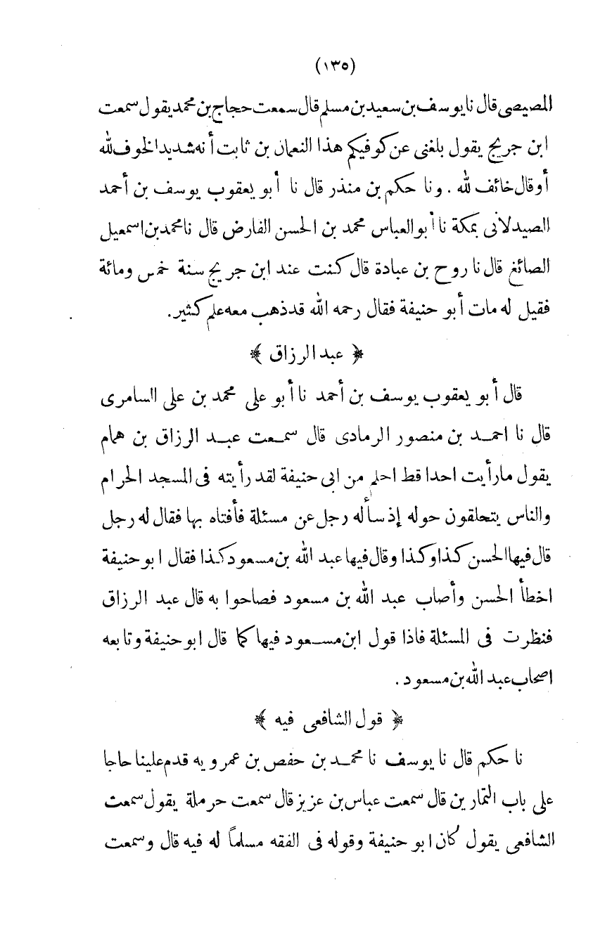 الْمِصِّيصِيُّ قَالَ نَا يُوسُفُ بْنُ سَعِيدِ بْنِ مُسْلِمٍ قَالَ سَمِعْتُ حَجَّاجَ بْنَ مُحَمَّدٍ يَقُولُ سَمِعْتُ ابْنَ جُرَيْجٍ يَقُولُ بَلَغَنِي عَنْ كُوفِيِّكُمْ هَذَا النُّعْمَانِ بْنِ ثَابِتٍ أَنَّهُ شَدِيدُ الْخَوْفِ للَّهِ أَوْ قَالَ خَائِفٌ للَّهِ وَنا حَكَمُ بْنُ مُنْذِرٍ قَالَ نَا أَبُو يَعْقُوبَ يُوسُفُ بْنُ أَحْمَدَ الصَّيْدَلانِيُّ بِمَكَّةَ نَا أَبُو الْعَبَّاسِ مُحَمَّد بن الْحسن الْفَارِضُ قَالَ نَا مُحَمَّدُ بْنُ إِسْمَاعِيلَ الصَّائِغُ قَالَ نَا رَوْحُ بْنُ عُبَادَةَ قَالَ كُنْتُ عِنْد ابْن جريج سنة خمس وَمِائَةٍ فَقِيلَ لَهُ مَاتَ أَبُو حَنِيفَةَ فَقَالَ رَحمَه الله قد ذهب مَعَه علم كثير