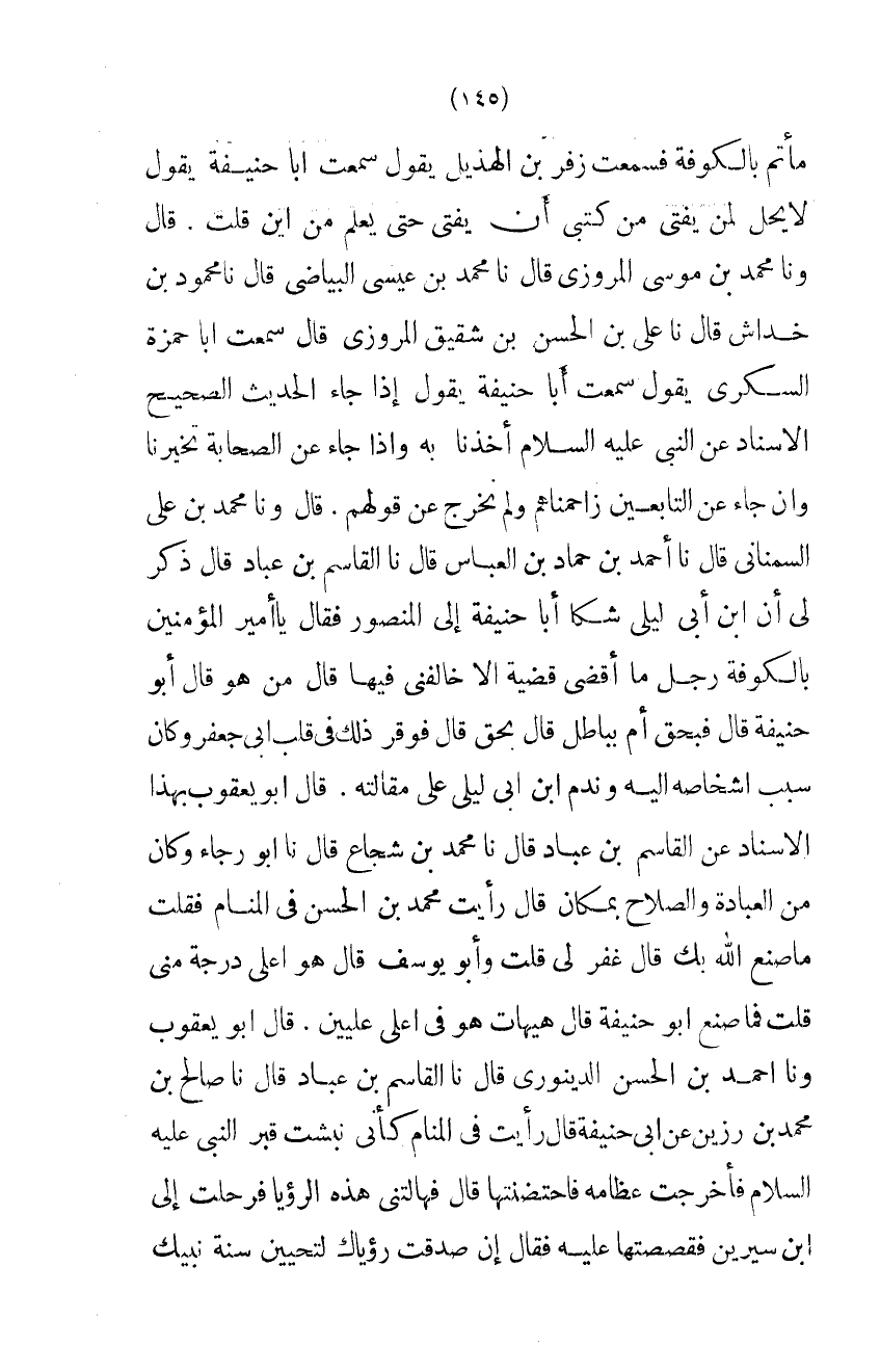 مَأْتَمٍ بِالْكُوفَةِ فَسَمِعْتُ زُفَرَ بْنَ الْهُذَيْلِ يَقُولُ سَمِعت ابا حنيفَة يَقُول لايحل لِمَنْ يُفْتِي مِنْ كُتُبِي أَنْ يُفْتِيَ حَتَّى يَعْلَمَ مِنْ أَيْنَ قُلْتُ قَالَ وَنا مُحَمَّدُ بْنُ مُوسَى الْمَرْوَزِيُّ قَالَ نَا مُحَمَّدُ بْنُ عِيسَى الْبَيَاضِيُّ قَالَ نَا مَحْمُودُ بْنُ خِدَاشٍ قَالَ نَا عَلِيُّ بْنُ الْحَسَنِ بْنِ شَقِيقٍ الْمَرْوَزِيُّ قَالَ سَمِعْتُ أَبَا حَمْزَةَ السُّكَّرِيَّ يَقُولُ سَمِعْتُ أَبَا حَنِيفَةَ يَقُولُ إِذَا جَاءَ الْحَدِيثُ الصَّحِيحُ الإِسْنَادِ عَنِ النَّبِيِّ عَلَيْهِ السَّلامُ أَخَذْنَا بِهِ وَإِذَا جَاءَ عَنِ الصَّحَابَةِ تَخَيَّرْنَا وَإِنْ جَاءَ عَنِ التَّابِعِينَ زَاحَمْنَاهُمْ وَلَمْ نَخْرُجْ عَنْ قَوْلِهِمْ قَالَ وَنا مُحَمَّدُ بْنُ عَلِيٍّ السِّمْنَانِيُّ قَالَ نَا أَحْمَدُ بْنُ حَمَّادِ بْنِ الْعَبَّاسِ قَالَ نَا الْقَاسِمُ بْنُ عَبَّادٍ قَالَ ذُكِرَ لِي أَنَّ ابْنَ أَبِي لَيْلَى شَكَا أَبَا حَنِيفَةَ إِلَى الْمَنْصُورِ فَقَالَ يَا أَمِيرَ الْمُؤْمِنِينَ بِالْكُوفَةِ رَجُلٌ مَا أَقْضِي قَضِيَّةً إِلا خَالَفَنِي فِيهَا قَالَ مَنْ هُوَ قَالَ أَبُو حَنِيفَةَ قَالَ فَبِحَقٍّ أَمْ بِبَاطِلٍ قَالَ بِحَقٍّ قَالَ فَوَقَرَ ذَلِكَ فِي قَلْبِ أَبِي جَعْفَرٍ وَكَانَ سَبَبَ إِشْخَاصِهِ إِلَيْهِ وَنَدِمَ ابْنُ أَبِي لَيْلَى عَلَى مَقَالَتِهِ قَالَ أَبُو يَعْقُوبَ بِهَذَا الإِسْنَادِ عَنِ الْقَاسِمِ بْنِ عَبَّادٍ قَالَ نَا مُحَمَّدُ بْنُ شُجَاعٍ قَالَ نَا أَبُو رَجَاءٍ وَكَانَ مِنَ الْعِبَادَةِ وَالصَّلاحِ بِمَكَانٍ قَالَ رَأَيْتُ مُحَمَّدَ بْنَ الْحَسَنِ فِي الْمَنَامِ فَقُلْتُ مَا صَنَعَ اللَّهُ بِكَ قَالَ غَفَرَ لِي قُلْتُ وَأَبُو يُوسُفَ قَالَ هُوَ أَعْلَى دَرَجَةً مِنِّي قُلْتُ فَمَا صَنَعَ أَبُو حَنِيفَةَ قَالَ هَيْهَاتَ هُوَ فِي أَعْلَى عِلِّيِّينَ قَالَ أَبُو يَعْقُوبَ وَنا أَحْمَدُ بْنُ الْحَسَنِ الدِّينَوَرِيُّ قَالَ نَا الْقَاسِمُ بْنُ عَبَّادٍ قَالَ نَا صَالِحُ بْنُ مُحَمَّدِ بْنِ رَزِينٍ عَنْ أَبِي حَنِيفَةَ قَالَ رَأَيْتُ فِي الْمَنَامِ كَأَنِّي نَبَشْتُ قَبْرَ النَّبِيِّ عَلَيْهِ السَّلامُ فَأَخْرَجْتُ عِظَامَهُ فَاحْتَضَنْتُهَا قَالَ فَهَالَتْنِي هَذِهِ الرُّؤْيَا فَرَحَلْتُ إِلَى ابْنِ سِيرِينَ فَقَصَصْتُهَا عَلَيْهِ فَقَالَ إِنْ صَدَقَتْ رُؤْيَاكَ لَتُحْيِيَنَّ سُنَّةَ نَبِيِّكَ