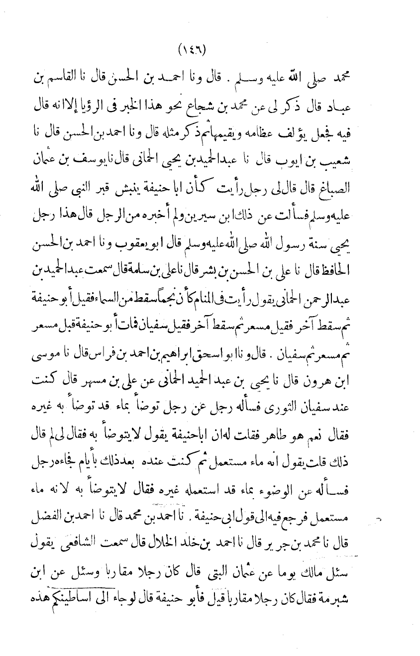 مُحَمَّدٍ صلى الله عَلَيْهِ وَسلم قَالَ وَنا أَحْمَدُ بْنُ الْحَسَنِ قَالَ نَا الْقَاسِمُ بْنُ عباد قَالَ ذكر لِي عَنْ مُحَمَّدِ بْنِ شُجَاعٍ نَحْوَ هَذَا الْخَبَرِ فِي الرُّؤْيَا إِلا أَنَّهُ قَالَ فِيهِ فَجَعَلَ يُؤَلِّفُ عِظَامَهُ وَيُقِيمُهَا ثُمَّ ذَكَرَ مِثْلَهُ قَالَ وَنا أَحْمَدُ بْنُ الْحَسَنِ قَالَ نَا شُعَيْب بن ايوب قَالَ نَا عبد الحميد بْنُ يَحْيَى الْحِمَّانِيُّ قَالَ نَا يُوسُفُ بْنُ عُثْمَانَ الصَّبَّاغُ قَالَ قَالَ لِي رَجُلٌ رَأَيْتُ كَأَنَّ أَبَا حَنِيفَةَ يَنْبُشُ قَبْرَ النَّبِيِّ صلى الله عَلَيْهِ وَسلم فَسَأَلْتُ عَنْ ذَلِكَ ابْنَ سِيرِينَ وَلَمْ أُخْبِرْهُ مَنِ الرَّجُلُ قَالَ هَذَا رَجُلٌ يُحْيِي سُنَّةَ رَسُولِ اللَّهِ صلى الله عَلَيْهِ وَسلم قَالَ أَبُو يَعْقُوبَ وَنا أَحْمَدُ بْنُ الْحَسَنِ الْحَافِظُ قَالَ نَا عَلِيُّ بْنُ الْحسن بن بشر قَالَ نَا عَلِيُّ بْنُ سَلَمَةَ قَالَ سَمِعْتُ عبد الحميد بن عبد الرحمن الحامانى يَقُولُ رَأَيْتُ فِي الْمَنَامِ كَأَنَّ نَجْمًا سَقَطَ مِنَ السَّمَاءِ فَقِيلَ أَبُو حَنِيفَةَ ثُمَّ سَقَطَ آخَرُ فَقِيلَ مِسْعَرٌ ثُمَّ سَقَطَ آخَرُ فَقِيلَ سُفْيَانُ فَمَاتَ أَبُو حَنِيفَةَ قَبْلَ مِسْعَرٍ ثُمَّ مسعر ثمَّ سُفْيَان قَالَ ونا ابو اسحق إِبْرَاهِيمُ بْنُ أَحْمَدَ بْنِ فِرَاسٍ قَالَ نَا مُوسَى ابْن هرون قَالَ نَا يحيى بن عبد الحميد الْحِمَّانِيُّ عَنْ عَلِيِّ بْنِ مُسْهِرٍ قَالَ كُنْتُ عِنْدَ سُفْيَانَ الثَّوْرِيِّ فَسَأَلَهُ رَجُلٌ عَنْ رَجُلٍ تَوَضَّأَ بِمَاءٍ قَدْ تَوَضَّأَ بِهِ غَيْرُهُ فَقَالَ نَعَمْ هُوَ طَاهِرٌ فَقُلْتُ لَهُ إِنَّ أَبَا حَنِيفَةَ يَقُولُ لَا يُتَوَضَّأُ بِهِ فَقَالَ لِي لِمَ قَالَ ذَلِكَ قُلْتُ يَقُولُ إِنَّهُ مَاءٌ مُسْتَعْمَلٌ ثُمَّ كُنْتُ عِنْدَهُ بَعْدَ ذَلِكَ بِأَيَّامٍ فَجَاءَهُ رَجُلٌ فَسَأَلَهُ عَنِ الْوُضُوءِ بِمَاءٍ قَدِ اسْتَعْمَلَهُ غَيْرُهُ فَقَالَ لَا يُتَوَضَّأُ بِهِ لأَنَّهُ مَاءٌ مُسْتَعْمَلٌ فَرَجَعَ فِيهِ إِلَى قَوْلِ أَبِي حَنِيفَةَ نَا أَحْمَدُ بْنُ مُحَمَّدٍ قَالَ نَا أَحْمَدُ بْنُ الْفَضْلِ قَالَ نَا مُحَمَّدُ بْنُ جرير قَالَ نَا احْمَد بن خلد الْخَلالُ قَالَ سَمِعْتُ الشَّافِعِيَّ يَقُولُ سُئِلَ مَالِكٌ يَوْمًا عَنْ عُثْمَانَ الْبَتِّيِّ قَالَ كَانَ رَجُلا مُقَارِبًا وَسُئِلَ عَنِ ابْنِ شُبْرُمَةَ فَقَالَ كَانَ رَجُلا مُقَارِبًا قِيلَ فَأَبُو حَنِيفَةَ قَالَ لَوْ جَاءَ إِلَى أَسَاطِينِكُمْ هَذِهِ