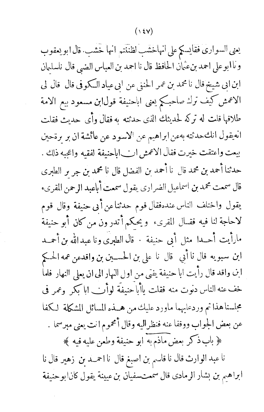 يَعْنِي السَّوَارِيَ فَقَايَسَكُمْ عَلَى أَنَّهَا خَشَبٌ لَظَنَنْتُمْ أَنَّهَا خَشَبٌ قَالَ أَبُو يَعْقُوبَ وَنا أَبُو عَلِيٍّ أَحْمَدُ بْنُ عُثْمَانَ الْحَافِظُ قَالَ نَا أَحْمَدُ بْنُ الْعَبَّاسِ الضَّبِّيُّ قَالَ نَا سُلَيْمَانُ ابْن أَبِي شَيْخٍ قَالَ نَا مُحَمَّدُ بْنُ عُمَرَ الحنفى عَن ابى عياد الْكُوفِيِّ قَالَ قَالَ لِي الأَعْمَشُ كَيْفَ تَرَكَ صَاحِبُكُمْ يَعْنِي أَبَا حَنِيفَةَ قَوْلَ ابْنِ مَسْعُودٍ بَيْعُ الأَمَةِ طَلاقُهَا قُلْتُ لَهُ تَرَكَهُ لِحَدِيثِكَ الَّذِي حَدَّثْتَهُ بِهِ فَقَالَ وَأَيُّ حَدِيثٍ فَقُلْتُ إِنَّهُ يَقُولُ إِنَّكَ حَدَّثْتَهُ بِهِ عَنْ إِبْرَاهِيمَ عَنِ الأَسْوَدِ عَنْ عَائِشَةَ أَنَّ بَرِيرَةَ حِينَ بِيعَتْ وَأُعْتِقَتْ خُيِّرَتْ فَقَالَ الأَعْمَشُ إِنَّ أَبَا حَنِيفَةَ لَفَقِيهٌ وَأَعْجَبَهُ ذَلِكَ حَدَّثَنَا أَحْمَدُ بْنُ مُحَمَّدٍ قَالَ نَا أَحْمَدُ بْنُ الْفَضْلِ قَالَ نَا مُحَمَّدُ بْنُ جَرِيرٍ الطَّبَرِيُّ قَالَ سَمِعْتُ مُحَمَّدَ بْنَ إِسْمَاعِيلَ الضِّرَارِيُّ يَقُولُ سَمِعْتُ أَبَا عبد الرَّحْمَن المقرء يَقُول وَاخْتلف النَّاس عِنْده قوم فَقَالَ قَوْمٌ حَدِّثْنَا عَنْ أَبِي حَنِيفَةَ وَقَالَ قَوْمٌ لَا حَاجَةَ لَنَا فِيهِ فَقَالَ الْمُقْرِئُ وَيْحَكُمْ أَتَدْرُونَ مَنْ كَانَ أَبُو حَنِيفَةَ مَا رَأَيْتُ أَحَدًا مِثْلَ أَبِي حَنِيفَةَ قَالَ الطَّبَرِيُّ ونا عبد الله بن أَحْمد ابْن سبويه قَالَ نَا أَبِي قَالَ نَا عَلِيُّ بْنُ الْحُسَيْن بن وَاقد عَن عَمه الحكم ابْن وَاقِدٍ قَالَ رَأَيْتُ أَبَا حَنِيفَةَ يُفْتِي مِنْ اول النَّهَار الى ان يعلى النَّهَارُ فَلَمَّا خَفَّ عَنْهُ النَّاسُ دَنَوْتُ مِنْهُ فَقُلْتُ يَا أَبَا حَنِيفَةَ لَوْ أَنَّ أَبَا بَكْرٍ وَعُمَرَ فِي مَجْلِسِنَا هَذَا ثُمَّ وَرَدَ عَلَيْهِمَا مَا وَرَدَ عَلَيْكَ مِنْ هَذِهِ الْمَسَائِلِ الْمُشْكَلَةِ لَكَفَّا عَنْ بَعْضِ الْجَوَابِ وَوَقَفَا عَنْهُ فَنَظَرَ إِلَيْهِ وَقَالَ أَمَحْمُومٌ أَنْتَ يَعْنِي مُبَرْسَمًا