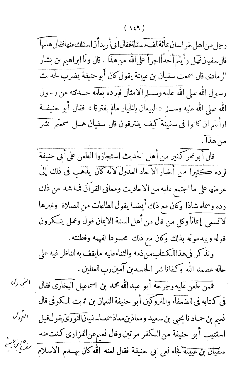 رجل من أهل خُرَاسَان بِمِائَة الف مسئلة فَقَالَ انى أُرِيد أَن أسئلك عَنْهَا فَقَالَ هَاتِهَا قَالَ سَمِعت سُفْيَانُ فَهَلْ رَأَيْتُمْ أَحَدًا أَجْرَأَ عَلَى اللَّهِ مِنْ هَذَا قَالَ وَنا إِبْرَاهِيمُ بْنُ بَشَّارٍ الرَّمَادِيُّ قَالَ سَمِعْتُ سُفْيَانَ بْنَ عُيَيْنَةَ يَقُولُ كَانَ أَبُو حَنِيفَةَ يَضْرِبُ لِحَدِيثِ رَسُولِ اللَّهِ صلى الله عَلَيْهِ وَسلم الأَمْثَالَ فَيَرُدُّهُ بِعِلْمِهِ حَدَّثْتُهُ عَنْ رَسُولِ اللَّهِ صلى الله عَلَيْهِ وَسلم (الْبَيِّعَانِ بِالْخِيَارِ مَا لَمْ يَفْتَرِقَا) فَقَالَ أَبُو حَنِيفَةَ أَرَأَيْتُمْ إِنْ كَانُوا فِي سَفِينَةٍ كَيْفَ يَفْتَرِقُونَ قَالَ سُفْيَانُ هَلْ سَمِعْتُمْ بِشَرٍّ مِنْ هَذَا