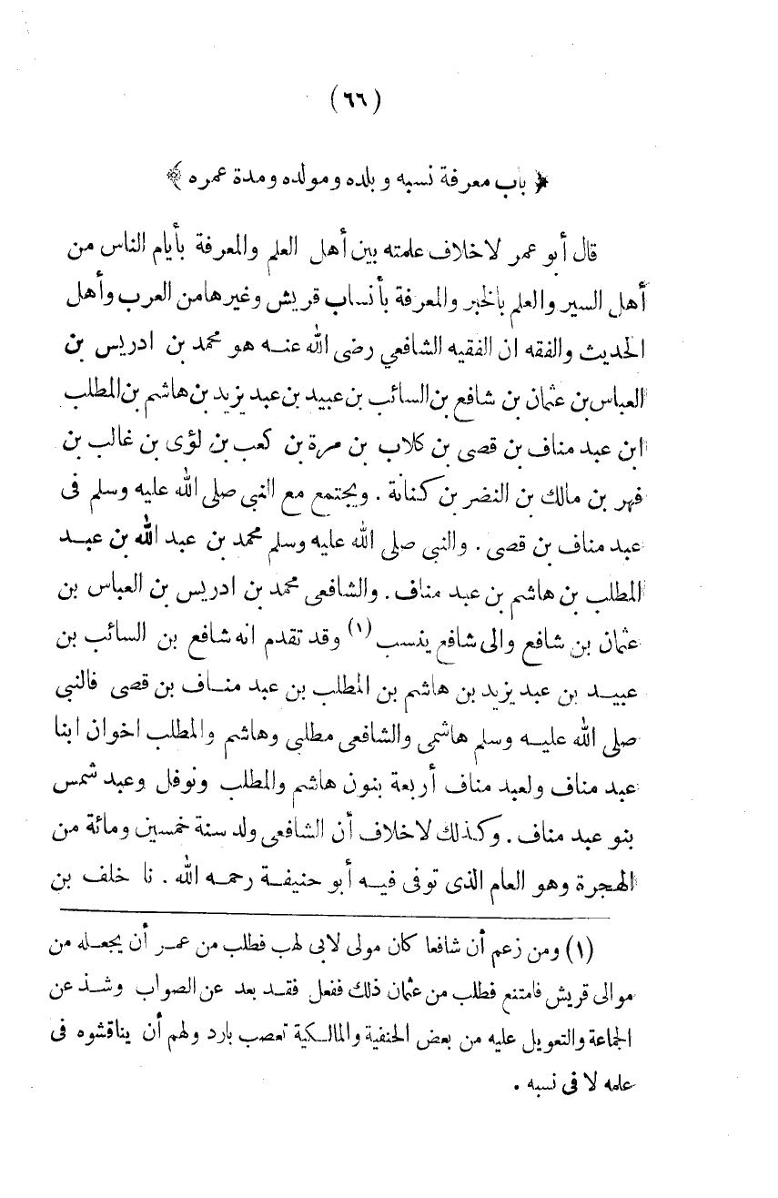 قَالَ أَبُو عمر لاخلاف عَلِمْتُهُ بَيْنَ أَهْلِ الْعِلْمِ وَالْمَعْرِفَةِ بِأَيَّامِ النَّاسِ مِنْ أَهْلِ السِّيَرِ وَالْعِلْمِ بِالْخَبَرِ وَالْمَعْرِفَةِ بِأَنْسَابِ قُرَيْش وَغَيرهَا من الْعَرَب وَأهل الحَدِيث أَن والفقيه الشَّافِعِيَّ رَضِيَ اللَّهُ عَنْهُ هُوَ مُحَمَّدُ بْنُ إِدْرِيسَ بْنِ الْعَبَّاسِ بْنِ عُثْمَانَ بْنِ شَافِعِ بْنِ السَّائِبِ بْنِ عُبَيْدِ بْنِ عَبْدِ يَزِيدَ بن هَاشم بن الْمطلب ابْن عَبْدِ مَنَافِ بْنِ قُصَيِّ بْنِ كِلابِ بْنِ مُرَّةَ بْنِ كَعْبِ بْنِ لُؤَيِّ بْنِ غَالِبِ بْنِ فِهْرِ بْنِ مَالِكِ بْنِ النَّضْرِ بْنِ كِنَانَةَ وَيَجْتَمِعُ مَعَ النَّبِيِّ صلى الله عَلَيْهِ وَسلم فى عبدمناف بْنِ قُصَيٍّ وَالنَّبِيُّ صلى الله عَلَيْهِ وَسلم مُحَمَّد بن عبد الله بن عبد المطلب بْنِ هَاشِمِ بْنِ عَبْدِ مَنَافٍ وَالشَّافِعِيُّ مُحَمَّدُ بْنُ إِدْرِيسَ بْنِ الْعَبَّاسِ بْنِ عُثْمَانَ بْنِ شَافِع والى شَافِع ينْسب وَقَدْ تَقَدَّمَ أَنَّهُ شَافِعُ بْنُ السَّائِبِ بْنِ عبيد بن عبديزيد بن هَاشم بن الْمطلب بن عبدمناف بْنِ قُصَيٍّ فَالنَّبِيُّ صلى الله عَلَيْهِ وَسلم هَاشِمِيٌّ وَالشَّافِعِيُّ مُطَّلِبِيٌّ وَهَاشِمٌ وَالْمُطَّلِبُ أَخَوَانِ ابْنَا عَبْدِ مَنَافٍ وَلِعَبْدِ مَنَافٍ أَرْبَعَةُ بَنُونَ هَاشِمٌ وَالْمطلب وَنَوْفَل وعبدشمس بَنو عبدمناف وَكَذَلِكَ لاخلاف أَنَّ الشَّافِعِيَّ وُلِدَ سَنَةَ خَمْسِينَ وَمِائَةٍ مِنَ الْهِجْرَةِ وَهُوَ الْعَامُ الَّذِي تُوُفِّيَ فِيهِ أَبُو حنيفَة رَحمَه الله نَا خَلَفُ بْنُ