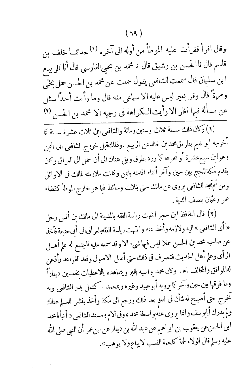وَقَالَ اقْرَأْ فَقَرَأْتُ عَلَيْهِ الْمُوَطَّأَ مِنْ أَوَّلِهِ إِلَى آخِرِهِ حَدَّثَنَا خَلفُ بْنُ قَاسِمٍ قَالَ نَا الْحَسَنُ بْنُ رَشِيقٍ قَالَ نَا مُحَمَّدُ بن يحيى الفارسى قَالَ أَنا الرّبيع ابْن سُلَيْمَانَ قَالَ سَمِعْتُ الشَّافِعِيَّ يَقُولُ حَمَلْتُ عَنْ مُحَمَّد بن الْحسن حمل بخى وَمرَّة قَالَ وقر بعير لَيْسَ عَلَيْهِ الاسماعى مِنْهُ قَالَ وَمَا رَأَيْتُ أَحَدًا سُئِلَ عَنْ مَسْأَلَةٍ فِيهَا نَظَرٌ إِلا رَأَيْتُ الْكَرَاهَةَ فِي وَجْهِهِ إِلا مُحَمَّدَ بْنَ الْحَسَنِ