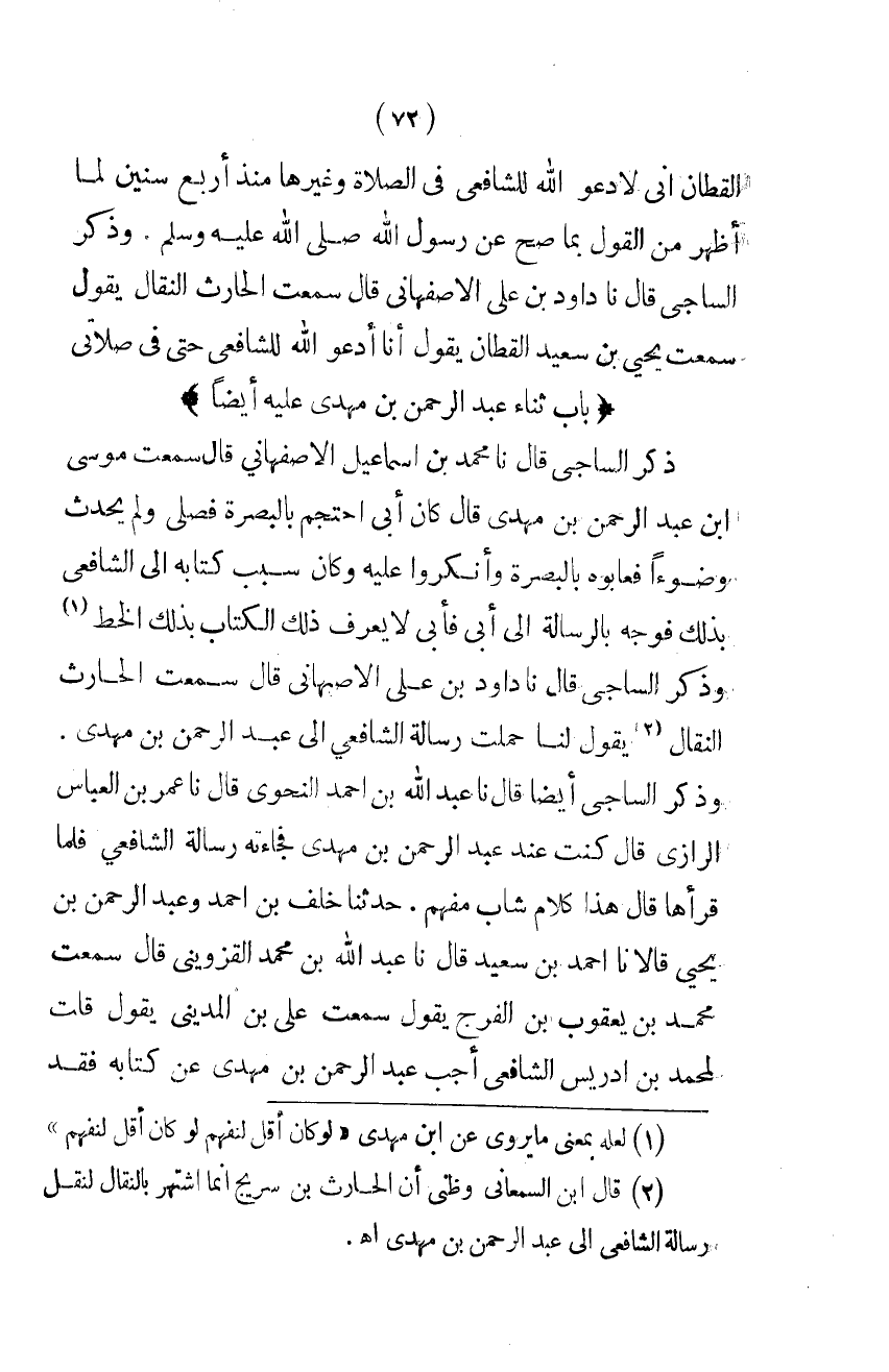 ذَكَرَ السَّاجِيُّ قَالَ نَا مُحَمَّدُ بْنُ إِسْمَاعِيلَ الأَصْفَهَانِيُّ قَالَ سَمِعْتُ مُوسَى ابْن عبد الرحمن بْنِ مَهْدِيٍّ قَالَ كَانَ أَبِي احْتَجَمَ بِالْبَصْرَةِ فَصَلَّى وَلَمْ يُحْدِثْ وُضُوءًا فَعَابُوهُ بِالْبَصْرَةِ وَأَنْكَرُوا عَلَيْهِ وَكَانَ سَبَبَ كِتَابِهِ إِلَى الشَّافِعِيِّ بِذَلِكَ فَوجه بالرسالة الى ابى فَأبى لايعرف ذَلِكَ الْكِتَابَ بِذَلِكَ الْخَطِّ وَذَكَرَ السَّاجِيُّ قَالَ نَا دَاوُدُ بْنُ عَلِيٍّ الأَصْبَهَانِيُّ قَالَ سَمِعْتُ الْحَارِثَ النَّقَّالَ يَقُولُ لَنَا حَمَلْتُ رِسَالَةَ الشَّافِعِيِّ إِلَى عَبْدِ الرَّحْمَنِ بْنِ مَهْدِيٍّ وَذَكَرَ السَّاجِيُّ ايضا قَالَ نَا عبد الله بْنُ أَحْمَدَ النَّحْوِيُّ قَالَ نَا عُمَرُ بْنُ الْعَبَّاس الرازى قَالَ كنت عِنْد عبد الرحمن بْنِ مَهْدِيٍّ فَجَاءَتْهُ رِسَالَةُ الشَّافِعِيِّ فَلَمَّا قَرَأَهَا قَالَ هَذَا كَلامُ شَابٍّ مُفْهِمٍ حَدَّثَنَا خَلَفُ بن احْمَد وعبد الرحمن بْنُ يَحْيَى قَالا نَا أَحْمَدُ بْنُ سَعِيدٍ قَالَ نَا عبد الله بْنُ مُحَمَّدٍ الْقَزْوِينِيُّ قَالَ سَمِعْتُ مُحَمَّدَ بْنَ يَعْقُوب بن الْفرج يَقُول سَمِعت على بن الْمَدِينِيِّ يَقُولُ قُلْتُ لِمُحَمَّدِ بْنِ إِدْرِيسَ الشَّافِعِيِّ أجب عبد الرحمن بْنَ مَهْدِيٍّ عَنْ كِتَابِهِ فَقَدْ