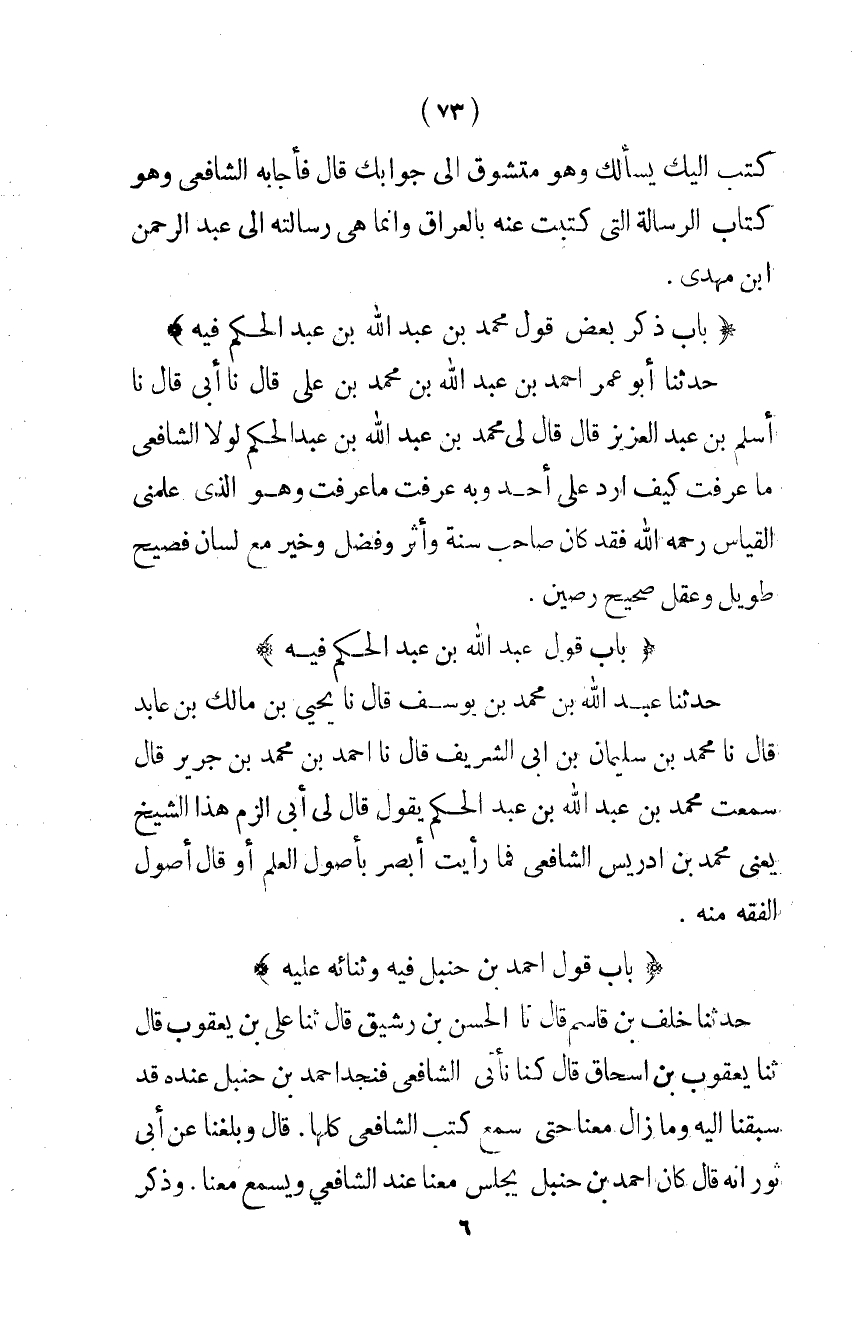 حَدثنَا عبد الله بْنُ مُحَمَّدِ بْنِ يُوسُفَ قَالَ نَا يَحْيَى بن مَالك بن عَابِد قَالَ نَا مُحَمَّدُ بْنُ سُلَيْمَانَ بْنِ أَبِي الشَّرِيفِ قَالَ نَا أَحْمَدُ بْنُ مُحَمَّدِ بْنِ جرير قَالَ سَمِعت مُحَمَّد بن عبد الله بن عبد الحكم يَقُول لِي أَبِي الْزَمْ هَذَا الشَّيْخَ يَعْنِي مُحَمَّدَ بْنَ إِدْرِيسَ الشَّافِعِيَّ فَمَا رَأَيْتُ أَبْصَرَ بِأُصُولِ الْعِلْمِ أَوْ قَالَ أُصُولِ الْفِقْهِ مِنْهُ