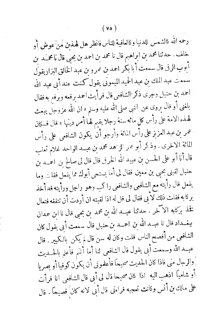 رَحِمَهُ اللَّهُ كَالشَّمْسِ لِلدُّنْيَا وَكَالْعَافِيَةِ لِلنَّاسِ فَانْظُرْ هَلْ لِهَذَيْنِ مِنْ عِوَضٍ أَوْ خَلَفٍ حَدَّثَنَا مُحَمَّدُ بْنُ إِبْرَاهِيمَ قَالَ نَا مُحَمَّدُ بْنُ أَحْمَدَ بْنِ يَحْيَى قَالَ نَا مُحَمَّدُ بْنُ أَيُّوبَ الرَّقِّيُّ قَالَ سَمِعْتُ أَبَا بَكْرٍ أَحْمَدَ بن عَمْرو بن عبد الخالق الْبَزَّار يَقُول سَمِعت عبد الملك بن عبد الحميد الميمونى يَقُول كنت عِنْد أَبى عبد الله أَحْمَدَ بْنِ حَنْبَلٍ وَجَرَى ذِكْرُ الشَّافِعِيِّ قَالَ فَرَأَيْتُ أَحْمَدَ يَرْفَعُهُ وَيَرْفَعُ بِهِ فَقَالَ بَلَغَنِي َأوْ قَالَ يُرْوَى عَنِ النَّبِيِّ صلى الله عَلَيْهِ وَسلم (إِنَّ اللَّهَ عَزَّ وَجَلَّ يَبْعَثُ لهَذِهِ الامة على رَأس مِائَةِ سَنَةٍ رَجُلا يُقِيمُ لَهَا أَمْرَ دِينِهَا) قَالَ فَكَانَ عمر بن عبد العزيز على رَأس كل الْمِائَةِ وَأَرْجُو أَنْ يَكُونَ الشَّافِعِيُّ عَلَى رَأْسِ الْمِائَةِ الأُخْرَى وَذَكَرَ أَبُو عُمَرَ الزَّاهِدُ مُحَمَّدُ بن عبد الواحد غُلَام ثَعْلَب قَالَ أَنا أَبُو على الْحسن بن عبيد الله الْخِرَقِيُّ قَالَ قَالَ لِي صَالِحُ بْنُ أَحْمَدَ بْنِ حَنْبَلٍ لَقِيَنِي يَحْيَى بْنُ مَعِينٍ فَقَالَ لِي أَمَا يَسْتَحِي أَبُوكَ مِمَّا يَفْعَلُ فَقُلْتُ وَمَا يَفْعَلُ قَالَ رَأَيْتُهُ مَعَ الشَّافِعِيِّ وَالشَّافِعِيُّ رَاكِبٌ وَهُوَ رَاجِلٌ وَرَأَيْتُهُ قَدْ أَخَذَ بِرِكَابِهِ فَقُلْتُ ذَلِكَ لأَبِي فَقَالَ لِي قُلْ لَهُ إِذَا لَقِيتَهُ إِنْ أَرَدْتَ أَنْ تَتَفَقَّهَ فَتَعَالَ فَخذ بركابه الآخر حَدثنَا عبد الله بْنُ مُحَمَّدِ بْنِ يَحْيَى قَالَ نَا ابْنُ حَمْدَانَ بِبَغْدَادَ قَالَ نَا عَبْدُ اللَّهِ بْنُ أَحْمَدَ بْنِ حَنْبَلٍ قَالَ سَمِعْتُ أَبِي يَقُولُ كَانَ الشَّافِعِيُّ مِنْ أَفْصَحِ النَّاسِ قُلْتُ وَكَانَ لَهُ سِنٌّ قَالَ لَمْ يَكُنْ بِالْكَبِيرِ قَالَ عبد الله وَسَمِعْتُ أَبِي يَقُولُ قَالَ الشَّافِعِيُّ لَنَا أَمَّا أَنْتُمْ فَأَعْلَمُ بِالْحَدِيثِ وَالرِّجَالِ مِنِّي فَإِذَا كَانَ الحَدِيث صَحِيحا فأعلمونى أَنْ يَكُونَ كُوفِيًّا أَوْ بَصْرِيًّا أَوْ شَامِيًّا أَذْهَبُ إِلَيْهِ إِذَا كَانَ صَحِيحًا قَالَ لِي أَبِي قَالَ الشَّافِعِيُّ أَنَا قَرَأْتُ عَلَى مَالِكِ بْنِ أَنَسٍ وَكَانَتْ تُعْجِبُهُ قِرَاءَتِي قَالَ أَبِي لأَنَّهُ كَانَ فَصِيحًا قَالَ