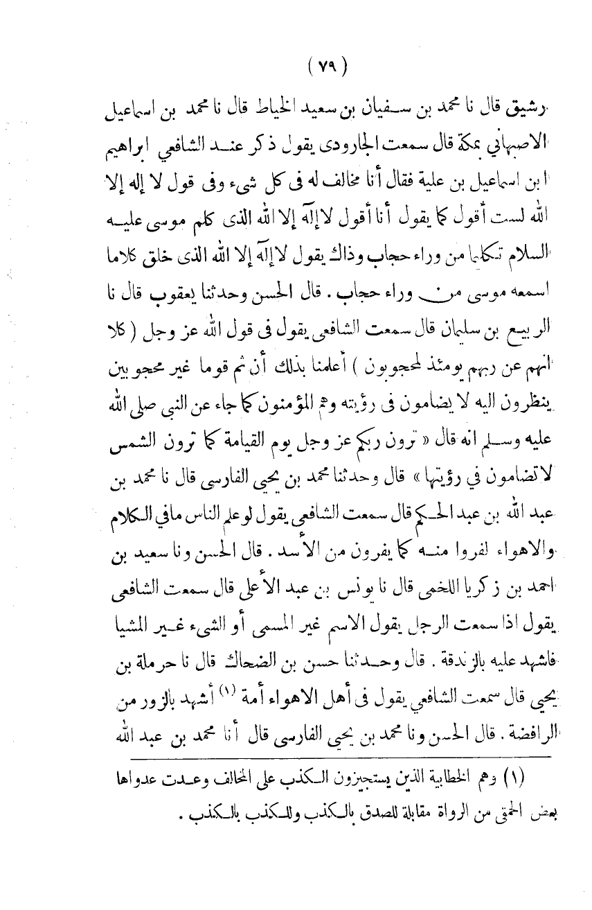 رَشِيقٍ قَالَ نَا مُحَمَّدُ بْنُ سُفْيَانَ بْنِ سَعِيدٍ الْخَيَّاطُ قَالَ نَا مُحَمَّدُ بْنُ إِسْمَاعِيلَ الأَصْبَهَانِيُّ بِمَكَّةَ قَالَ سَمِعْتُ الْجَارُودِيَّ يَقُولُ ذُكِرَ عِنْد الشَّافِعِي ابراهيم ابْن اسماعيل بن عُلَيَّةَ فَقَالَ أَنَا مُخَالِفٌ لَهُ فِي كُلِّ شئ وَفِي قَوْلِ لَا إِلَهَ إِلا اللَّهُ لَسْتُ أَقُولُ كَمَا يَقُولُ أَنَا أَقُولُ لَا إِلَهَ إِلا اللَّهُ الَّذِي كَلَّمَ مُوسَى عَلَيْهِ السَّلامُ تَكْلِيمًا مِنْ وَرَاءِ حِجَابٍ وَذَاكَ يَقُولُ لَا إِلَهَ إِلا اللَّهُ الَّذِي خَلَقَ كَلامًا أَسْمَعَهُ مُوسَى مِنْ وَرَاءِ حِجَابٍ قَالَ الْحَسَنُ وَحَدَّثَنَا يَعْقُوبَ قَالَ نَا الرَّبِيعُ بْنُ سُلَيْمَانَ قَالَ سَمِعْتُ الشَّافِعِيَّ يَقُولُ فِي قَوْلِ اللَّهِ عَزَّ وَجَلَّ {كَلَّا إِنَّهُمْ عَنْ رَبِّهِمْ يَوْمَئِذٍ لَمَحْجُوبُونَ} أعلمنَا بذلك أَن ثمَّ قوما غير محجوبون يَنْظُرُونَ إِلَيْهِ لَا يُضَامُونَ فِي رُؤْيَتِهِ وَهُمُ الْمُؤْمِنُونَ كَمَا جَاءَ عَنِ النَّبِيِّ صلى الله عَلَيْهِ وَسلم أَنَّهُ قَالَ (تَرَوْنَ رَبَّكُمْ عَزَّ وَجَلَّ يَوْمَ الْقِيَامَةِ كَمَا تَرَوْنَ الشَّمْسَ لَا تُضَامُونَ فِي رُؤْيَتِهَا) قَالَ وَحَدَّثَنَا مُحَمَّدُ بْنُ يحيى الفارسى قَالَ نَا مُحَمَّد بن عبد الله بن عبد الحكم قَالَ سَمِعْتُ الشَّافِعِيَّ يَقُولُ لَوْ عَلِمَ النَّاسُ مَا فِي الْكَلامِ وَالأَهْوَاءِ لَفَرُّوا مِنْهُ كَمَا يَفِرُّونَ مِنَ الأَسَدِ قَالَ الْحَسَنُ وَنا سَعِيدُ بْنُ أَحْمَدَ بْنِ زَكَرِيَّا اللَّخْمِيُّ قَالَ نَا يُونُس بن عبد الأعلى قَالَ سَمِعْتُ الشَّافِعِيَّ يَقُولُ إِذَا سَمِعْتَ الرَّجُلَ يَقُول الِاسْم غير الْمُسَمّى أَو الشئ غَيْرُ الْمُشَيَّا فَاشْهَدْ عَلَيْهِ بِالزَّنْدَقَةِ قَالَ وَحَدَّثَنَا حسن بْنِ الضَّحَّاكِ قَالَ نَا حَرْمَلَةُ بْنُ يَحْيَى قَالَ سَمِعْتُ الشَّافِعِيَّ يَقُولُ فِي أَهْلِ الأَهْوَاءِ أُمَّةٌ أَشْهَدُ بِالزُّورِ مِنَ الرَّافِضَةِ قَالَ الْحَسَنُ وَنا مُحَمَّدُ بْنُ يَحْيَى الْفَارِسِيُّ قَالَ أَنا مُحَمَّد بن عبد الله