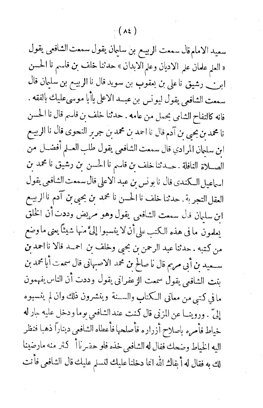 سَعِيدٍ الإِمَامُ قَالَ سَمِعْتُ الرَّبِيعَ بْنَ سُلَيْمَانَ يَقُولُ سَمِعْتُ الشَّافِعِيَّ يَقُولُ الْعِلْمُ عِلْمَانِ عِلْمُ الأَدْيَانِ وَعِلْمُ الأَبْدَانِ حَدَّثَنَا خَلَفُ بْنُ قَاسِمٍ نَا الْحسن ابْن رَشِيقٍ نَا عَلِيُّ بْنُ يَعْقُوبَ بْنِ سُوَيْدٍ قَالَ نَا الرَّبِيعُ بْنُ سُلَيْمَانَ قَالَ سَمِعْتُ الشافعى يَقُول ليونس بن عبد الاعلى يَا أَبَا مُوسَى عَلَيْكَ بِالْفِقْهِ فَإِنَّهُ كَالتُّفَّاحِ الشَّامِيِّ يُحْمَلُ مِنْ عَامِهِ حَدَّثَنَا خَلَفُ بْنُ قَاسِمٍ قَالَ نَا الْحَسَنُ نَا مُحَمَّدُ بْنُ يَحْيَى بْنِ آدَمَ قَالَ نَا أَحْمَدُ بْنُ مُحَمَّدِ بْنِ جَرِيرٍ النَّحْوِيُّ قَالَ نَا الرَّبِيعُ ابْن سُلَيْمَانَ الْمُرَادِيُّ قَالَ سَمِعْتُ الشَّافِعِيَّ يَقُولُ طَلَبُ الْعِلْمِ أَفْضَلُ مِنَ الصَّلاةِ النَّافِلَةِ حَدَّثَنَا خَلَفُ بْنُ قَاسِمٍ نَا الْحَسَنُ بْنُ رَشِيقٍ نَا مُحَمَّدُ بْنُ إِسْمَاعِيلَ الْكِنْدِيُّ قَالَ نَا يُونُسُ بن عبد الاعلى قَالَ سَمِعْتُ الشَّافِعِيَّ يَقُولُ الْعَقْلُ التَّجْرِبَةُ حَدَّثَنَا خَلَفٌ نَا الْحَسَنُ نَا مُحَمَّدُ بْنُ يَحْيَى بن آدم نَا الرّبيع ابْن سُلَيْمَانَ قَالَ سَمِعْتُ الشَّافِعِيَّ يَقُولُ وَهُوَ مَرِيضٌ وَدِدْتُ أَنَّ الْخَلْقَ يَعْلَمُونَ مَا فِي هَذِهِ الْكُتُبِ عَلَى أَنْ لَا يَنْسُبُوا إِلَيَّ مِنْهَا شَيْئًا يَعْنِي مَا وَضَعَ مِنْ كُتُبِهِ حَدَّثَنَا عبد الرحمن بْنُ يَحْيَى وَخَلَفُ بْنُ أَحْمَدَ قَالا نَا احْمَد بن سعيد بن أَبى مَرْيَم قَالَ نَا صَالِحُ بْنُ مُحَمَّدٍ الأَصْبَهَانِيُّ قَالَ سَمِعت أَبَا مُحَمَّد بن بنت الشافعى يَقُول سَمِعت الزعفرانى يَقُولُ وَدِدْتُ أَنَّ النَّاسَ يَفْهَمُونَ مَا فِي كُتُبِي مِنْ مَعَانِيَ الْكِتَابِ وَالسُّنَّةِ وَيَنْشُرُونَ ذَلِكَ وَإِنْ لَمْ يَنْسُبُوهُ إِلَيَّ وَرُوِّينَا عَنِ الْمُزَنِيِّ قَالَ كُنْتُ عِنْدَ الشَّافِعِيِّ يَوْمًا وَدَخَلَ عَلَيْهِ جَارٌ لَهُ خَيَّاطٌ فَأَمَرَهُ بِإِصْلاحِ أَزْرَارِهِ فَأَصْلَحَهَا فَأَعْطَاهُ الشَّافِعِيُّ دِينَارًا ذَهَبًا فَنَظَرَ إِلَيْهِ الْخَيَّاطُ وَضَحِكَ فَقَالَ لَهُ الشَّافِعِيُّ خُذْهُ فَلَوْ حَضَرَنَا أَكْثَرُ مِنْهُ مَا رَضِينَا لَكَ بِهِ فَقَالَ لَهُ أبقاك الله انما دَخَلنَا عَلَيْك لِنُسَلِّمَ عَلَيْكَ قَالَ الشَّافِعِيُّ فَأَنْتَ