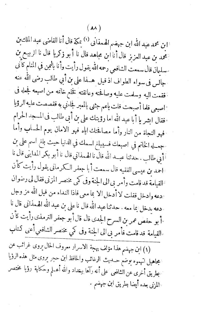 ابْن مُحَمَّد عبد الله ابْن جَهْضَم الهمذانى بِمَكَّة قَالَ أَنا القاضى عبد الملك بن مُحَمَّد بن عبد العزيز قَالَ أَنا ابْنُ مُجَاهِدٍ قَالَ نَا أَبُو زَكَرِيَّا قَالَ نَا الرَّبِيعُ بْنُ سُلَيْمَانَ قَالَ سَمِعْتُ الشَّافِعِيَّ رَحِمَهُ اللَّهُ يَقُولُ رَأَيْتُ وَأَنَا بِالْيَمَنِ فِي الْمَنَامِ كَأَنِّي جَالِسٌ فِي سَوَاءِ الطَّوَافِ إِذْ قِيلَ هَذَا عَلِيُّ بْنُ أَبِي طَالِبٍ رَضِيَ الله عَنهُ فَقُمْت اليه وسلمت عَلَيْهِ وَصَافَحْتُهُ وَعَانَقْتُهُ فَخَلَعَ خَاتَمَهُ مِنْ إِصْبَعِهِ فَجَعَلَهُ فِي إِصَبْعِي فَلَمَّا أَصْبَحْتُ قُلْتُ يَا عَمُّ جِئْنِي بِالْمُعَبِّرِ فَجَاءَنِي بِهِ فَقَصَصْتُ عَلَيْهِ الرُّؤْيَا فَقَالَ اُبْشُرْ يَا ابا عبد الله أَمَّا رُؤْيَتُكَ عَلِيَّ بْنَ أَبِي طَالِبٍ فِي الْمَسْجِدِ الْحَرَامِ فَهُوَ النَّجَاةُ مِنَ النَّارِ وَأَمَّا مُصَافَحَتُكَ إِيَّاهُ فَهُوَ الأَمَانُ يَوْمَ الْحِسَابِ وَأَمَّا جَعْلُهُ الْخَاتَمَ فِي إِصْبَعِكَ فَسَيَبْلُغُ اسْمُكَ فِي الدُّنْيَا حَيْثُ بلغ اسْم على بن أبي طَالب حَدثنَا عبد الله قَالَ نَا الْهَمَذَانِيُّ قَالَ نَا أَبُو بَكْرٍ المداينى قَالَ نَا أَحْمَدُ بْنُ عِيسَى الْفَقِيهُ قَالَ سَمِعْتُ أَبَا جَعْفَرٍ الْكِرْمَانِيَّ يَقُولُ رَأَيْتُ كَأَنَّ الْقِيَامَةَ قَدْ قَامَتْ وَأُمِرَ بِي إِلَى الْجَنَّةِ وَفِي كُمِّي مُخْتَصَرُ الْمُزَنِيِّ فَقَالَ لِي رِضْوَانُ دَعْهُ وَادْخُلْ فَقُلْتُ لَا أَدْخُلُ إِلا بِمَا مَعِي فَإِذَا النِّدَاءُ مِنْ قِبَلِ اللَّهِ عَزَّ وَجل دَعه يدْخل بِمَا مَعَه حَدثنَا عبد الله قَالَ نَا على بن عبد الله الْهَمَذَانِيُّ قَالَ نَا أَبُو حَفْصٍ عُمَرُ بْنُ السَّرْح الْجَدِّيُّ قَالَ قَالَ أَبُو جَعْفَرٍ التِّرْمِذِيُّ رَأَيْتُ كَأَنَّ الْقِيَامَةَ قَدْ قَامَتْ فَأُمِرَ بِي إِلَى الْجَنَّةِ وَفِي كُمِّي مُخْتَصَرُ الشَّافِعِيِّ أَعْنِي كِتَابَ