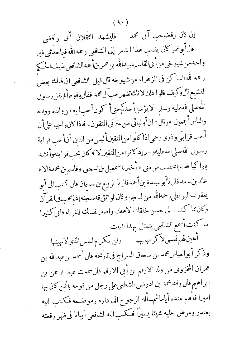 قَالَ أَبُو عُمَرَ كَانَ يُنْسَبُ هَذَا الشِّعْرُ إِلَى الشَّافِعِيِّ رَحِمَهُ اللَّهُ فِيمَا حَدَّثَنِي غَيْرُ وَاحِدٍ مِنْ شُيُوخِي عَنْ أَبِي الْقَاسِمِ عُبَيْدِ اللَّهِ بْنِ عُمَرَ بْنِ أَحْمَدَ الشَّافِعِيِّ ضَيْفِ الْحَكَمِ رَحِمَهُ اللَّهِ السَّاكِنِ فِي الزَّهْرَاءِ عَنْ شُيُوخِهِ قَالَ قِيلَ لِلشَّافِعِيِّ ان فِيك بعض التَّشَيُّع قَالَ وَكَيف قَالُوا ذَلِك لأَنَّكَ تُظْهِرُ حُبَّ آلِ مُحَمَّدٍ فَقَالَ يَا قَوْمِ أَلَمْ يَقُلْ رَسُولُ اللَّهِ صلى الله عَلَيْهِ وَسلم (لَا يُؤْمِنُ أَحَدُكُمْ حَتَّى أَكُونَ أَحَبَّ إِلَيْهِ مِنْ وَالِدِهِ وَوَلَدِهِ وَالنَّاسِ أَجْمَعِينَ) وَقَالَ (إِنَّ أَوْلِيَائِي مِنْ عِتْرَتِي الْمُتَّقُونَ) فَإِذَا كَانَ وَاجِبًا عَلَيَّ أَنْ أُحِبَّ قَرَابَتِي وَذَوِي رَحِمِي إِذَا كَانُوا مِنَ الْمُتَّقِينَ أَلَيْسَ مِنَ الدِّينِ أَنْ أُحِبَّ قَرَابَةَ رَسُولَ اللَّهِ صلى الله عَلَيْهِ وَسلم إِذْ كَانُوا مِنَ الْمُتَّقِينَ لأَنَّهُ كَانَ يُحِبُّ قَرَابَتَهُ وَأَنْشَدَ
