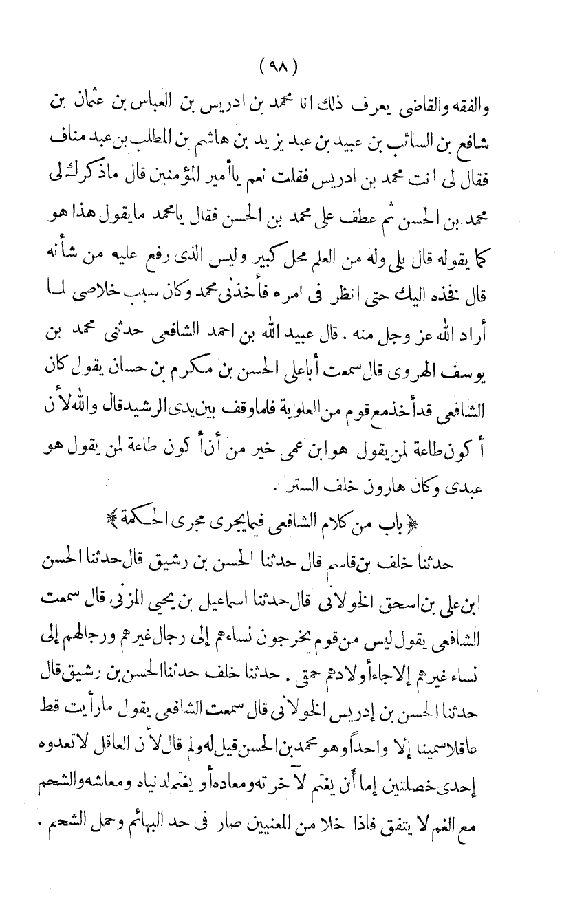 وَالْفِقْهِ وَالْقَاضِي يَعْرِفُ ذَلِكَ أَنَا مُحَمَّدُ بْنُ إِدْرِيسَ بْنِ الْعَبَّاسِ بْنِ عُثْمَانَ بْنِ شَافِعِ بن السَّائِب بن عبيد بن عبديزيد بن هَاشم بن الْمطلب بن عبدمناف فَقَالَ لِي أَنْتَ مُحَمَّدُ بْنُ إِدْرِيسَ فَقُلْتُ نَعَمْ يَا أَمِيرَ الْمُؤْمِنِينَ قَالَ مَا ذَكَرَكَ لِي مُحَمَّدُ بْنُ الْحَسَنِ ثُمَّ عَطَفَ عَلَى مُحَمَّدِ بْنِ الْحَسَنِ فَقَالَ يَا مُحَمَّدُ مَا يَقُولُ هَذَا هُوَ كَمَا يَقُولُهُ قَالَ بَلَى وَله من الْعلم مَحل كَبِيرٌ وَلَيْسَ الَّذِي رُفِعَ عَلَيْهِ مِنْ شَأْنِهِ قَالَ فَخُذْهُ إِلَيْكَ حَتَّى أَنْظُرَ فِي أَمْرِهِ فَأَخَذَنِي مُحَمَّدٌ وَكَانَ سَبَبَ خَلاصِي لِمَا أَرَادَ الله عز وَجل مِنْهُ قَالَ عبيد الله بْنُ أَحْمَدَ الشَّافِعِيُّ حَدَّثَنِي مُحَمَّدُ بْنُ يُوسُفَ الْهَرَوِيُّ قَالَ سَمِعْتُ أَبَا عَلِيٍّ الْحَسَنَ بْنَ مُكْرِمِ بْنِ حَسَّانٍ يَقُولُ كَانَ الشَّافِعِيُّ قَدْ أَخَذَ مَعَ قَوْمٍ مِنَ الْعَلَوِيَّةِ فَلَمَّا وَقَفَ بَيْنَ يَدَيِ الرَّشِيدِ قَالَ وَاللَّهِ لأَنْ أَكُونَ طَاعَةً لِمَنْ يَقُولُ هُوَ ابْنُ عَمِّي خَيْرٌ مِنْ أَنْ أَكُونَ طَاعَةً لِمَنْ يَقُولُ هُوَ عَبْدِي وَكَانَ هَارُونُ خَلْفَ السِّتْرِ