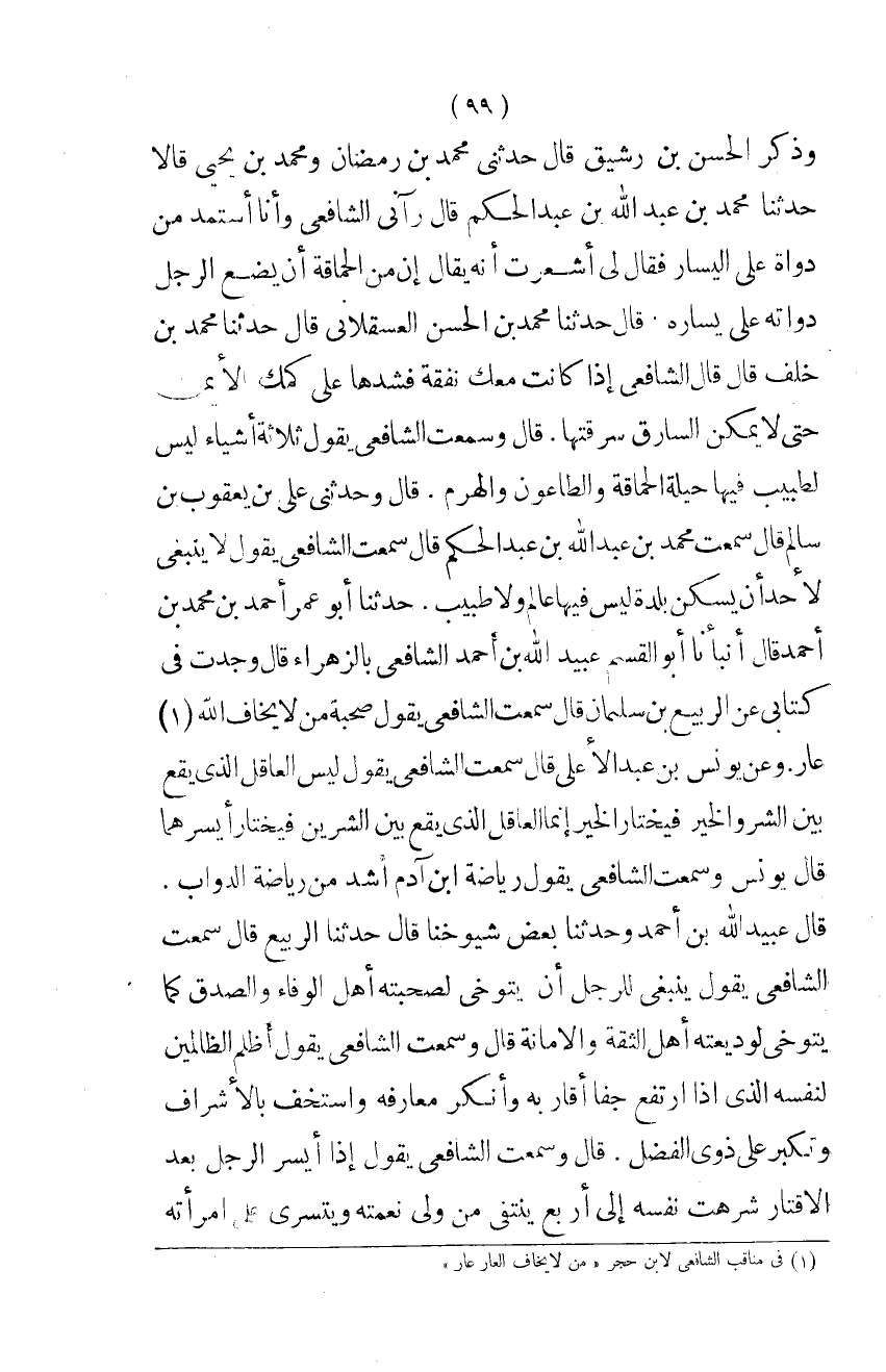 وَذَكَرَ الْحَسَنُ بْنُ رَشِيقٍ قَالَ حَدَّثَنِي مُحَمَّدُ بْنُ رَمَضَانَ وَمُحَمَّدُ بْنُ يَحْيَى قَالا حَدَّثَنَا مُحَمَّد بن عبد الله بْنِ عَبْدِ الْحَكَمِ قَالَ رَآنِي الشَّافِعِيُّ وَأَنَا أَسْتَمِدُّ مِنْ دَوَاةٍ عَلَى الْيَسَارِ فَقَالَ لِي أَشَعَرْتَ أَنَّهُ يُقَالُ إِنَّ مِنَ الْحَمَاقَةِ أَنْ يَضَعَ الرَّجُلُ دَوَاتَهُ عَلَى يَسَارِهِ قَالَ حَدَّثَنَا مُحَمَّدُ بْنُ الْحَسَنِ الْعَسْقَلانِيُّ قَالَ حَدَّثَنَا مُحَمَّدُ بْنُ خَلَفٍ قَالَ قَالَ الشَّافِعِيُّ إِذَا كَانَتْ مَعَكَ نَفَقَةٌ فَشُدَّهَا عَلَى كُمِّكَ الأَيْمَنِ حَتَّى لَا يُمكن السَّارِق سَرِقَتَهَا قَالَ وَسَمِعْتُ الشَّافِعِيَّ يَقُولُ ثَلاثَةُ أَشْيَاءَ لَيْسَ لِطَبِيبٍ فِيهَا حِيلَةٌ الْحَمَاقَةُ وَالطَّاعُونُ وَالْهَرَمُ قَالَ وَحَدَّثَنِي عَلِيُّ بْنُ يَعْقُوبَ بْنِ سَالِمٍ قَالَ سَمِعت مُحَمَّد بن عبد الله بن عبد الحكم قَالَ سَمِعْتُ الشَّافِعِيَّ يَقُولُ لَا يَنْبَغِي لأَحَدٍ أَنْ يَسْكُنَ بَلْدَةً لَيْسَ فِيهَا عَالِمٌ وَلَا طَبِيبٌ حَدَّثَنَا أَبُو عُمَرَ أَحْمَدُ بْنُ مُحَمَّدِ بن أَحْمد قَالَ أَنبأَنَا أَبُو الْقسم عبيد الله بْنُ أَحْمَدَ الشَّافِعِيُّ بِالزَّهْرَاءِ قَالَ وَجَدْتُ فِي كِتَابِي عَنِ الرَّبِيعِ بْنِ سُلَيْمَانَ قَالَ سَمِعْتُ الشَّافِعِيَّ يَقُولُ صُحْبَةُ مَنْ لَا يَخَافُ اللَّهُ عَار وَعَن يُونُس بن عبد الأعلى قَالَ سَمِعْتُ الشَّافِعِيَّ يَقُولُ لَيْسَ الْعَاقِلُ الَّذِي يَقع بَين الشَّرّ وَالْخَيْر فَيَخْتَارُ الْخَيْرَ إِنَّمَا الْعَاقِلُ الَّذِي يَقَعُ بَيْنَ الشَّرَّيْنِ فَيَخْتَارُ أَيْسَرَهُمَا قَالَ يُونُسُ وَسَمِعْتُ الشَّافِعِيَّ يَقُولُ رِيَاضَةُ ابْنِ آدَمَ أَشَدُّ مِنْ رِيَاضَةِ الدَّوَابّ قَالَ عبيد الله بْنُ أَحْمَدَ وَحَدَّثَنَا بَعْضُ شُيُوخِنَا قَالَ حَدَّثَنَا الرَّبِيعُ قَالَ سَمِعْتُ الشَّافِعِيَّ يَقُولُ يَنْبَغِي لِلرَّجُلِ أَنْ يَتَوَخَّى لِصُحْبَتِهِ أَهْلَ الْوَفَاءِ وَالصِّدْقِ كَمَا يَتَوَخَّى لِوَدِيعَتِهِ أَهْلَ الثِّقَةِ وَالأَمَانَةِ قَالَ وَسَمِعْتُ الشَّافِعِيَّ يَقُولُ أَظْلَمُ الظَّالِمِينَ لِنَفْسِهِ الَّذِي إِذَا ارْتَفَعَ جَفَا أَقَارِبَهُ وَأَنْكَرَ مَعَارِفَهُ وَاسْتَخَفَّ بِالأَشْرَافِ وَتَكَبَّرَ عَلَى ذَوِي الْفَضْلِ قَالَ وَسَمِعْتُ الشَّافِعِيَّ يَقُولُ إِذَا أَيْسَرَ الرَّجُلُ بَعْدَ الإِقْتَارِ شَرِهَتْ نَفْسُهُ إِلَى أَرْبَعٍ يَنْتَفِي مِنْ وَلِيِّ نِعْمَتِهِ وَيَتَسَرَّى عَلَى امْرَأَتِهِ