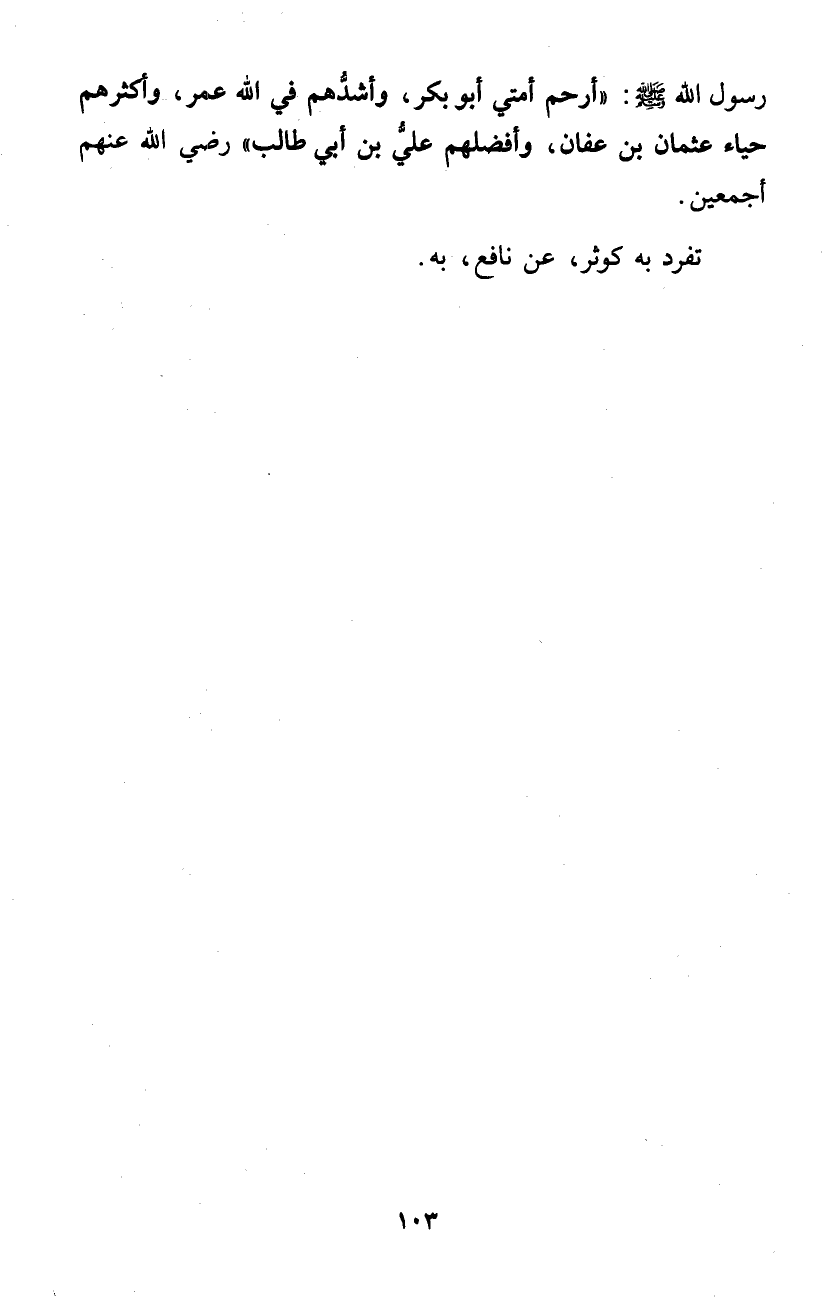 رَسُول الله صلى الله عَلَيْهِ وَسلم أرْحم أمتِي أَبُو بكر وأشدهم فِي الله عمر وَأَكْثَرهم حَيَاء عُثْمَان بن عَفَّان وأفضلهم عَليّ بن أبي طَالب رَضِي الله عَنْهُم أَجْمَعِينَ