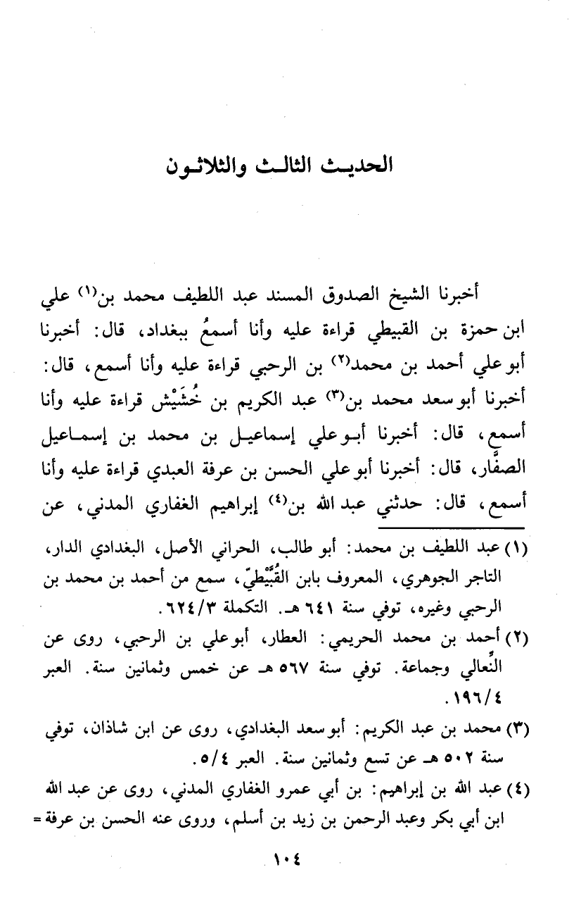 أخبرنَا الشَّيْخ الصدوق الْمسند عبد اللَّطِيف مُحَمَّد بن عَليّ ابْن حَمْزَة بن القبيطي قِرَاءَة عَلَيْهِ وَأَنا أسمع بِبَغْدَاد قَالَ أخبرنَا أَبُو عَليّ أَحْمد بن مُحَمَّد بن الرَّحبِي قِرَاءَة عَلَيْهِ وَأَنا أسمع قَالَ أخبرنَا أَبُو سعد مُحَمَّد بن عبد الْكَرِيم بن خشيش قِرَاءَة عَلَيْهِ وَأَنا أسمع قَالَ أخبرنَا أَبُو عَليّ إِسْمَاعِيل بن مُحَمَّد بن إِسْمَاعِيل الصفار قَالَ أخبرنَا أَبُو عَليّ الْحسن بن عَرَفَة الْعَبْدي قِرَاءَة عَلَيْهِ وَأَنا أسمع قَالَ حَدثنِي عبد الله بن إِبْرَاهِيم الْغِفَارِيّ الْمدنِي عَن