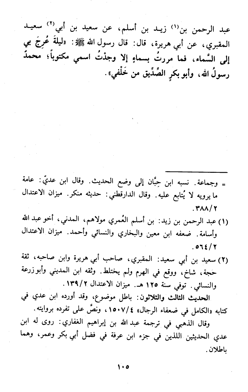 عبد الرَّحْمَن بن زيد بن أسلم عَن سعيد بن أبي سعيد المَقْبُري عَن أبي هُرَيْرَة قَالَ قَالَ رَسُول الله صلى الله عَلَيْهِ وَسلم لَيْلَة عرج بِي إِلَى السَّمَاء فَمَا مَرَرْت بسماء إِلَّا وجدت اسْمِي مَكْتُوبًا مُحَمَّد رَسُول الله وَأَبُو بكر الصّديق من خَلْفي