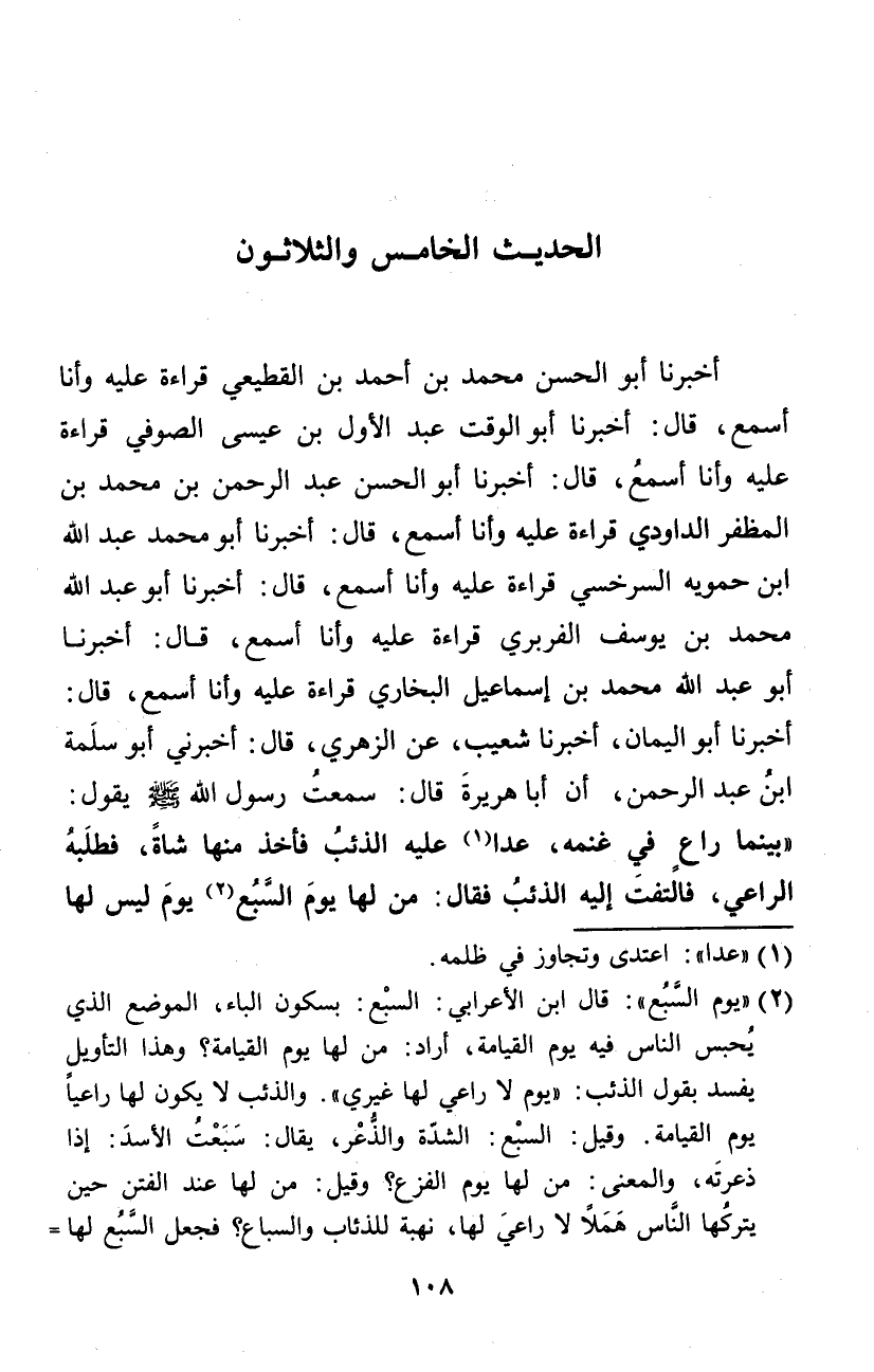 أخبرنَا أَبُو الْحسن مُحَمَّد بن أَحْمد بن الْقطيعِي قِرَاءَة عَلَيْهِ وَأَنا أسمع 0 قَالَ أخبرنَا أَبُو الْوَقْت عبد الأول بن عِيسَى الصُّوفِي قِرَاءَة عَلَيْهِ وَأَنا أسمع قَالَ أخبرنَا أَبُو الْحسن عبد الرَّحْمَن بن مُحَمَّد بن المظفر الدَّاودِيّ قِرَاءَة عَلَيْهِ وَأَنا أسمع قَالَ أخبرنَا أَبُو مُحَمَّد عبد الله ابْن حمويه السَّرخسِيّ قِرَاءَة عَلَيْهِ وَأَنا أسمع قَالَ أخبرنَا أَبُو عبد الله مُحَمَّد بن يُوسُف الْفربرِي قِرَاءَة عَلَيْهِ وَأَنا أسمع قَالَ أخبرنَا أَبُو عبد الله مُحَمَّد بن إِسْمَاعِيل البُخَارِيّ قِرَاءَة عَلَيْهِ وَأَنا أسمع قَالَ أخبرنَا أَبُو الْيَمَان أخبرنَا شُعَيْب عَن الزُّهْرِيّ قَالَ أَخْبرنِي أَبُو سَلمَة ابْن عبد الرَّحْمَن أَن أَبَا هُرَيْرَة قَالَ سَمِعت رَسُول الله صلى الله عَلَيْهِ وَسلم يَقُول بَيْنَمَا رَاع فِي غنمه عدا عَلَيْهِ الذِّئْب فَأخذ مِنْهَا شَاة فَطَلَبه الرَّاعِي فَالْتَفت إِلَيْهِ الذِّئْب فَقَالَ من لَهَا يَوْم السَّبع يَوْم لَيْسَ لَهَا