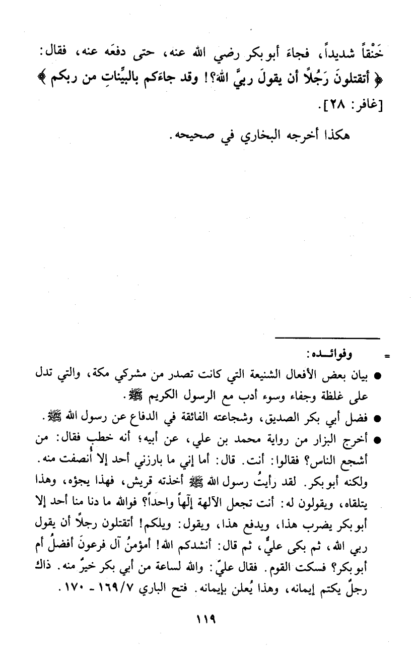 خنقا شَدِيدا فجَاء أَبُو بكر رَضِي الله عَنهُ حَتَّى دَفعه عَنهُ فَقَالَ {أَتقْتلونَ رجلا أَن يَقُول رَبِّي الله وَقد جَاءَكُم بِالْبَيِّنَاتِ من ربكُم} غَافِر: 28