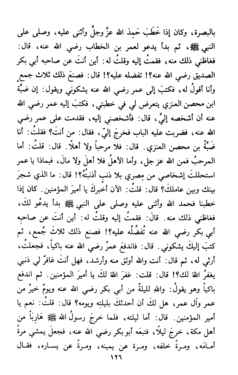 بِالْبَصْرَةِ وَكَانَ إِذا خطب حمد الله عز وَجل وَأثْنى عَلَيْهِ وَصلى على النَّبِي صلى الله عَلَيْهِ وَسلم ثمَّ بَدَأَ يَدْعُو لعمر بن الْخطاب رَضِي الله عَنهُ قَالَ فغاظني ذَلِك مِنْهُ فَقُمْت إِلَيْهِ وَقلت لَهُ أَيْن أَنْت عَن صَاحبه أبي بكر الصّديق رَضِي الله عَنهُ تفضله عَلَيْهِ قَالَ فَصنعَ ذَلِك ثَلَاث جمع وَأَنا أَقُول لَهُ فَكتب إِلَى عمر رَضِي الله عَنهُ يشكوني وَيَقُول إِن ضبة ابْن مُحصن الْعَنزي يتَعَرَّض لي فِي خطبتي فَكتب إِلَيْهِ عمر رَضِي الله عَنهُ أَن أشخصه إِلَيْهِ قَالَ فأشخصني إِلَيْهِ فَقدمت على عمر رَضِي الله عَنهُ فَضربت عَلَيْهِ الْبَاب فَخرج إِلَيّ فَقَالَ من أَنْت فَقلت أَنا ضبة بن مُحصن الْعَنزي قَالَ فَلَا مرْحَبًا وَلَا أَهلا قَالَ قلت أما المرحب فَمن الله عز وَجل وَأما الْأَهْل فَلَا أهل وَلَا مَال فبماذا يَا عمر استحللت إشخاصي من مصري بِلَا ذَنْب أذنبته قَالَ مَا الَّذِي شجر بَيْنك وَبَين عاملك قَالَ قلت الْآن أخْبرك يَا أَمِير الْمُؤمنِينَ كَانَ إِذا خَطَبنَا فَحَمدَ الله وَأثْنى عَلَيْهِ وَصلى على النَّبِي صلى الله عَلَيْهِ وَسلم بَدَأَ يَدْعُو لَك فغاظني ذَلِك مِنْهُ قَالَ فَقُمْت إِلَيْهِ وَقلت لَهُ أَيْن أَنْت عَن صَاحبه أبي بكر رَضِي الله عَنهُ تفضله عَلَيْهِ فَصنعَ ذَلِك ثَلَاث جُمع ثمَّ كتب إِلَيْك يشكوني قَالَ فَانْدفع عمر رَضِي الله عَنهُ باكيا فَجعلت أرثي لَهُ ثمَّ قَالَ أَنْت وَالله أوثق مِنْهُ وأرشد فَهَل أَنْت غَافِر لي ذَنبي يغْفر الله لَك قَالَ قلت غفر الله لَك يَا أَمِير الْمُؤمنِينَ ثمَّ انْدفع باكيا وَهُوَ يَقُول وَالله لليلة من أبي بكر رَضِي الله عَنهُ وَيَوْم خير من عمر وَآل عمر هَل لَك أَن أحَدثك بليلته ويومه قَالَ قلت نعم يَا أَمِير الْمُؤمنِينَ قَالَ أما ليلته فَلَمَّا خرج رَسُول الله صلى الله عَلَيْهِ وَسلم هَارِبا من أهل مَكَّة خرج لَيْلًا فَتَبِعَهُ أَبُو بكر رَضِي الله عَنهُ فَجعل يمشي مرّة أَمَامه وَمرَّة خَلفه وَمرَّة عَن يَمِينه وَمرَّة عَن يسَاره فَقَالَ