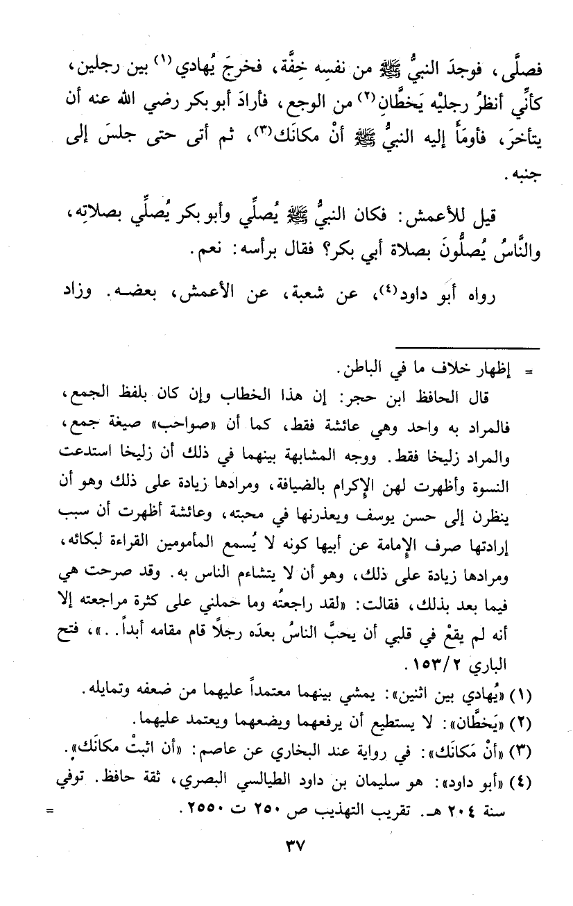 فصلى فَوجدَ النَّبِي صلى الله عَلَيْهِ وَسلم من نَفسه خفَّة فَخرج يهادي بَين رجلَيْنِ كَأَنِّي أنظر رجلَيْهِ يخطان من الوجع فَأَرَادَ أَبُو بكر رَضِي الله عَنهُ أَن يتَأَخَّر فَأَوْمأ إِلَيْهِ النَّبِي صلى الله عَلَيْهِ وَسلم أَن مَكَانك ثمَّ أَتَى حَتَّى جلس إِلَى جنبه