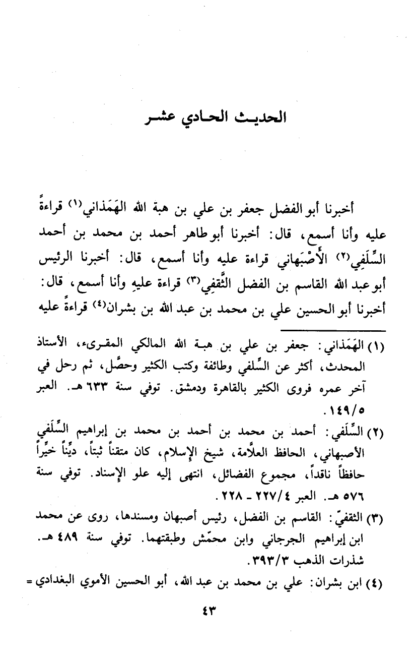 أخبرنَا أَبُو الْفضل جَعْفَر بن عَليّ بن هبة الله الهمذاني قِرَاءَة عَلَيْهِ وَأَنا أسمع قَالَ أخبرنَا أَبُو طَاهِر أَحْمد بن مُحَمَّد بن أَحْمد السلَفِي الْأَصْبَهَانِيّ قِرَاءَة عَلَيْهِ وَأَنا أسمع قَالَ أخبرنَا الرئيس أَبُو عبد الله الْقَاسِم بن الْفضل الثَّقَفِيّ قِرَاءَة عَلَيْهِ وَأَنا أسمع قَالَ أخبرنَا أَبُو الْحُسَيْن عَليّ بن مُحَمَّد بن عبد الله بن بَشرَان قِرَاءَة عَلَيْهِ