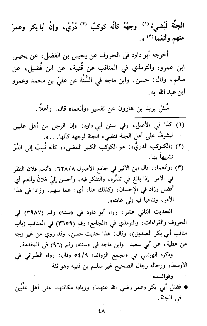 أخرجه أَبُو دَاوُد فِي الْحُرُوف عَن يحيى بن الْفضل عَن يحيى ابْن عَمْرو وَالتِّرْمِذِيّ فِي المناقب عَن قُتَيْبَة عَن ابْن فُضَيْل عَن سَالم وَقَالَ حسن وَابْن مَاجَه فِي السّنة عَن عَليّ بن مُحَمَّد وَعَمْرو ابْن عبد الله بِهِ