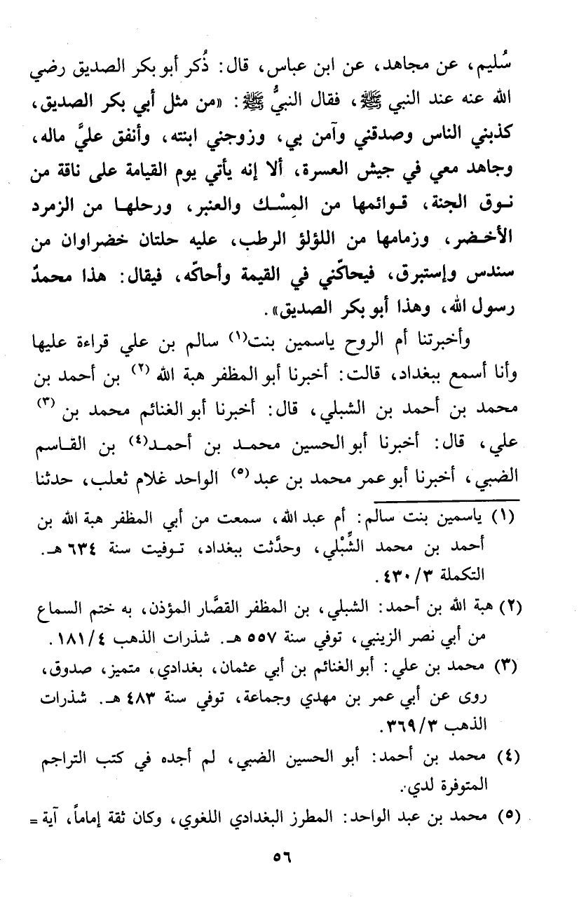 وأخبرتنا أم الرّوح ياسمين بنت سَالم بن عَليّ قِرَاءَة عَلَيْهَا وَأَنا أسمع بِبَغْدَاد قَالَت أخبرنَا أَبُو المظفر هبة الله بن أَحْمد بن مُحَمَّد بن أَحْمد بن الشبلي قَالَ أخبرنَا أَبُو الْغَنَائِم مُحَمَّد بن عَليّ قَالَ أخبرنَا أَبُو الْحُسَيْن مُحَمَّد بن أَحْمد بن الْقَاسِم الضَّبِّيّ أخبرنَا أَبُو عمر مُحَمَّد بن عبد الْوَاحِد غُلَام ثَعْلَب حَدثنَا