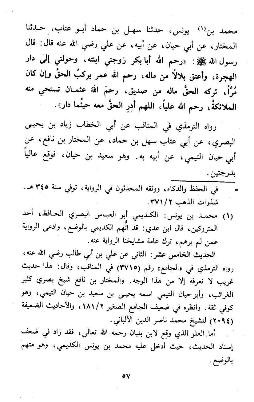 مُحَمَّد بن يُونُس حَدثنَا سهل بن حَمَّاد أَبُو عتاب حَدثنَا الْمُخْتَار عَن أبي حَيَّان عَن أَبِيه عَن عَليّ رَضِي الله عَنهُ قَالَ قَالَ رَسُول الله صلى الله عَلَيْهِ وَسلم رحم الله أَبَا بكر زَوجنِي ابْنَته وحولني إِلَى دَار الْهِجْرَة وَأعْتق بِلَالًا من مَاله رحم الله عمر يركبُ الْحق وَإِن كَانَ مرا تَركه الْحق مَاله من صديق رحم الله عُثْمَان تَسْتَحي مِنْهُ الْمَلَائِكَة رحم الله عليا اللَّهُمَّ أدر الْحق مَعَه حَيْثُمَا دَار