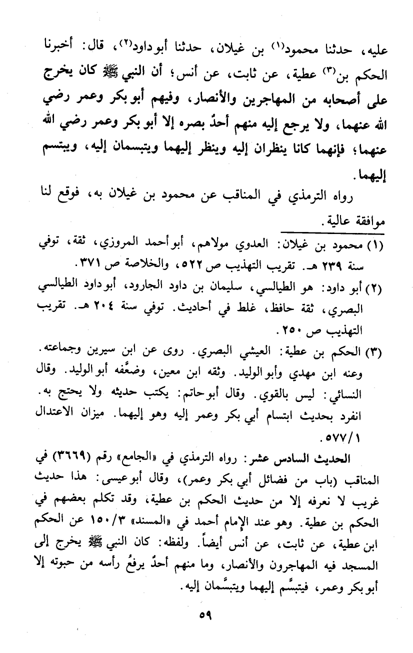 عَلَيْهِ حَدثنَا مَحْمُود بن غيلَان حَدثنَا أَبُو دَاوُد قَالَ أخبرنَا الحكم بن عَطِيَّة عَن ثَابت عَن أنس أَن النَّبِي صلى الله عَلَيْهِ وَسلم كَانَ يخرج على أَصْحَابه من الْمُهَاجِرين وَالْأَنْصَار وَفِيهِمْ أَبُو بكر وَعمر رَضِي الله عَنْهُمَا وَلَا يرجع إِلَيْهِ مِنْهُم أحد بَصَره إِلَّا أَبُو بكر وَعمر رَضِي الله عَنْهُمَا فَإِنَّهُمَا كَانَا ينْظرَانِ إِلَيْهِ وَينظر إِلَيْهِمَا ويبتسمان إِلَيْهِ ويبتسم إِلَيْهِمَا