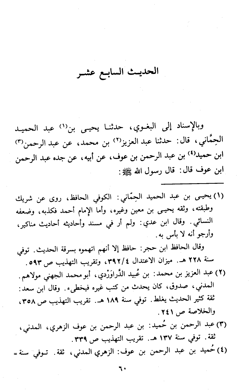 وَبِالْإِسْنَادِ إِلَى الْبَغَوِيّ حَدثنَا يحيى بن عبد الحميد الْحمانِي قَالَ حَدثنَا عبد الْعَزِيز بن مُحَمَّد عَن عبد الرَّحْمَن ابْن حميد بن عبد الرَّحْمَن بن عَوْف عَن أَبِيه عَن جده عبد الرَّحْمَن ابْن عَوْف قَالَ قَالَ رَسُول الله صلى الله عَلَيْهِ وَسلم
