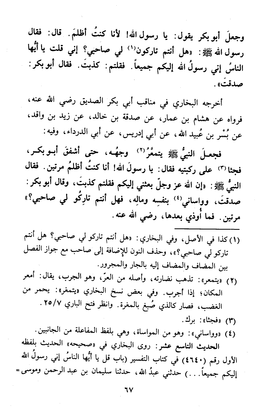 وَجعل أَبُو بكر يَقُول يَا رَسُول الله لأَنا كنت أظلم قَالَ فَقَالَ رَسُول الله صلى الله عَلَيْهِ وَسلم هَل أَنْتُم تاركون لي صَاحِبي إِنِّي قلت يَا أَيهَا النَّاس إِنِّي رَسُول الله إِلَيْكُم جَمِيعًا فقلتم كذبت فَقَالَ أَبُو بكر صدقت