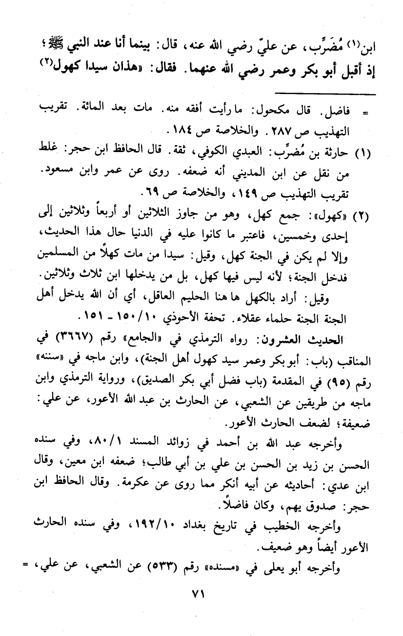 ابْن مضرب عَن عَليّ رَضِي الله عَنهُ قَالَ بَيْنَمَا أَنا عِنْد النَّبِي صلى الله عَلَيْهِ وَسلم إِذْ أقبل أَبُو بكر وَعمر رَضِي الله عَنْهُمَا فَقَالَ هَذَانِ سيدا كهول