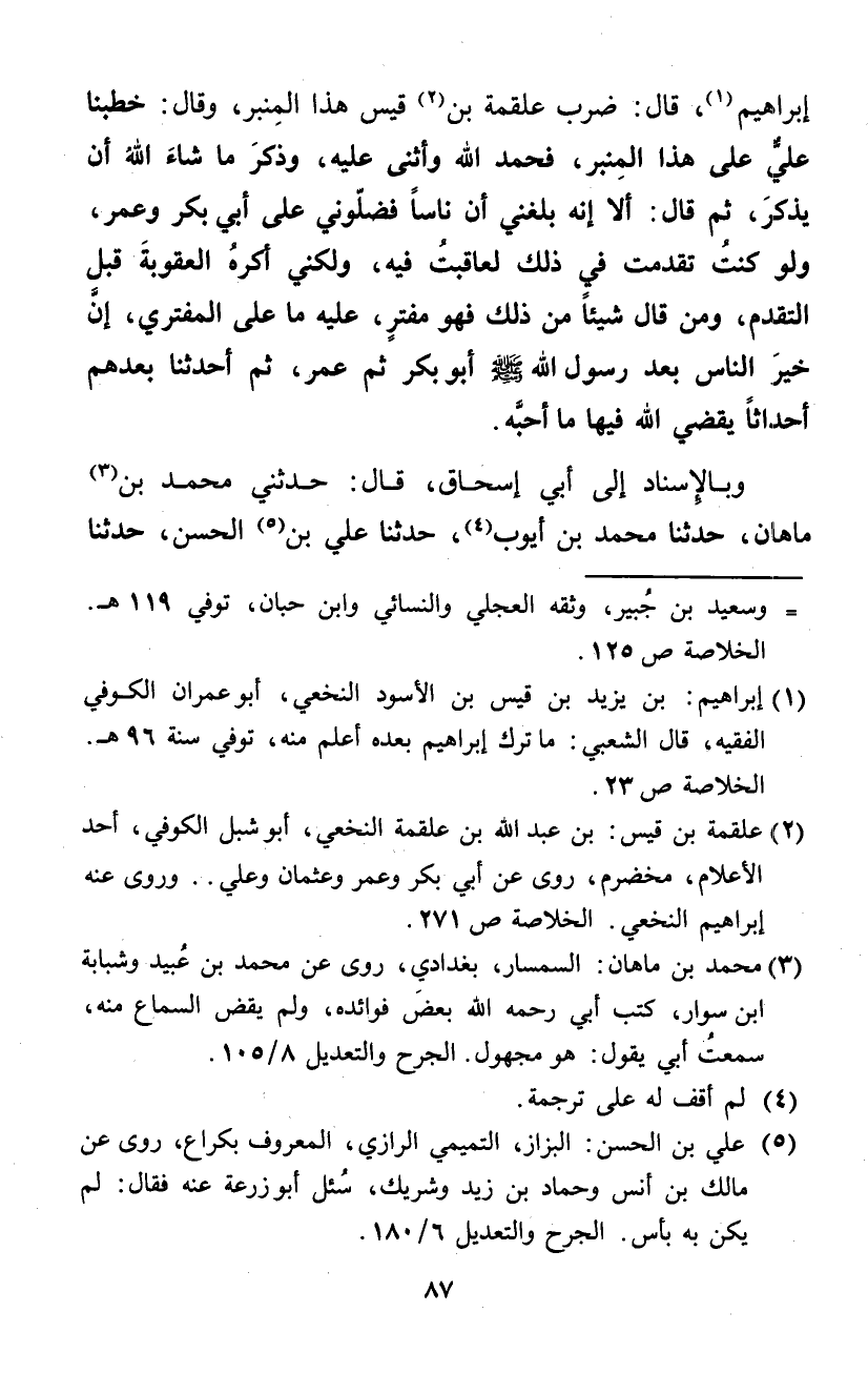 إِبْرَاهِيم قَالَ ضرب عَلْقَمَة بن قيس هَذَا الْمِنْبَر وَقَالَ خَطَبنَا عَليّ على هَذَا الْمِنْبَر فَحَمدَ الله وَأثْنى عَلَيْهِ وَذكر مَا شَاءَ الله أَن يذكر ثمَّ قَالَ أَلا إِنَّه بَلغنِي أَن نَاسا فضلوني على أبي بكر وَعمر وَلَو كنت تقدّمت فِي ذَلِك لعاقبت فِيهِ وَلَكِنِّي أكره الْعقُوبَة قبل التَّقَدُّم وَمن قَالَ شَيْئا من ذَلِك فَهُوَ مفتر عَلَيْهِ مَا على المفتري إِن خير النَّاس بعد رَسُول الله صلى الله عَلَيْهِ وَسلم أَبُو بكر ثمَّ عمر ثمَّ أحدثنا بعدهمْ أحداثا يقْضِي الله فِيهَا مَا أحبه
