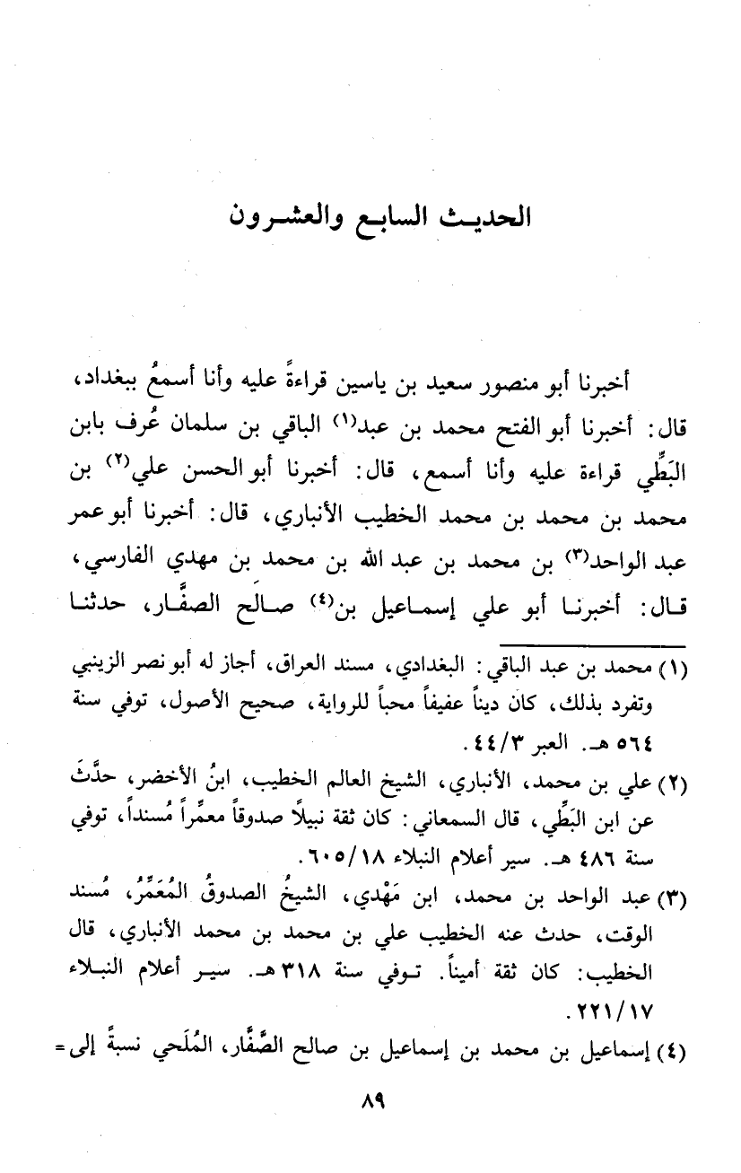 أخبرنَا أَبُو مَنْصُور سعيد بن ياسين قِرَاءَة عَلَيْهِ وَأَنا أسمع بِبَغْدَاد قَالَ أخبرنَا أَبُو الْفَتْح مُحَمَّد بن عبد الْبَاقِي بن سلمَان عرف بِابْن البطي قِرَاءَة عَلَيْهِ وَأَنا أسمع قَالَ أخبرنَا أَبُو الْحسن عَليّ بن مُحَمَّد بن مُحَمَّد بن مُحَمَّد الْخَطِيب الْأَنْبَارِي قَالَ أخبرنَا أَبُو عمر عبد الْوَاحِد بن مُحَمَّد بن عبد الله بن مُحَمَّد بن مهْدي الْفَارِسِي قَالَ أخبرنَا أَبُو عَليّ إِسْمَاعِيل بن صَالح الصفار حَدثنَا