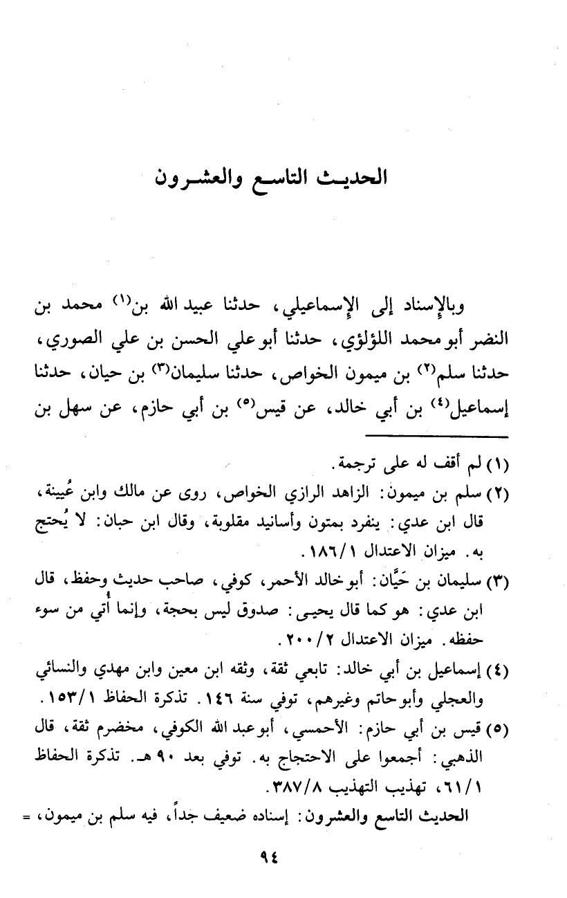 وَبِالْإِسْنَادِ إِلَى الْإِسْمَاعِيلِيّ حَدثنَا عبيد الله بن مُحَمَّد بن النَّضر أَبُو مُحَمَّد اللؤْلُؤِي حَدثنَا أَبُو عَليّ الْحسن بن عَليّ الصُّورِي حَدثنَا سلم بن مَيْمُون الْخَواص حَدثنَا سُلَيْمَان بن حَيَّان حَدثنَا إِسْمَاعِيل بن أبي خَالِد عَن قيس بن أبي حَازِم عَن سهل بن