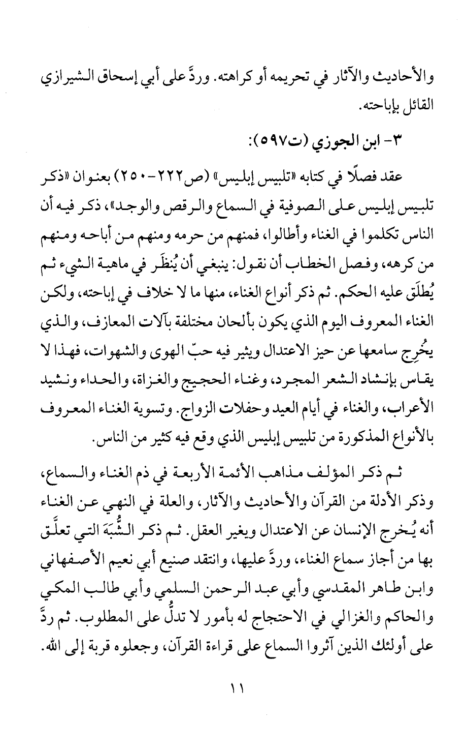 عقد فصلًا في كتابه "تلبيس إبليس" (ص 222 - 250) بعنوان "ذكر تلبيس إبليس على الصوفية في السماع والرقص والوجد"، ذكر فيه أن الناس تكلموا في الغناء وأطالوا، فمنهم من حرمه ومنهم من أباحه ومنهم من كرهه، وفصل الخطاب أن نقول: ينبغي أن يُنظَر في ماهية الشيء ثم يُطلَق عليه الحكم. ثم ذكر أنواع الغناء، منها ما لا خلاف في إباحته، ولكن الغناء المعروف اليوم الذي يكون بألحان مختلفة بآلات المعازف، والذي يُخرِج سامعها عن حيز الاعتدال ويثير فيه حبّ الهوى والشهوات، فهذا لا يقاس بإنشاد الشعر المجرد، وغناء الحجيج والغزاة، والحداء ونشيد الأعراب، والغناء في أيام العيد وحفلات الزواج. وتسوية الغناء المعروف بالأنواع المذكورة من تلبيس إبليس الذي وقع فيه كثير من الناس.
