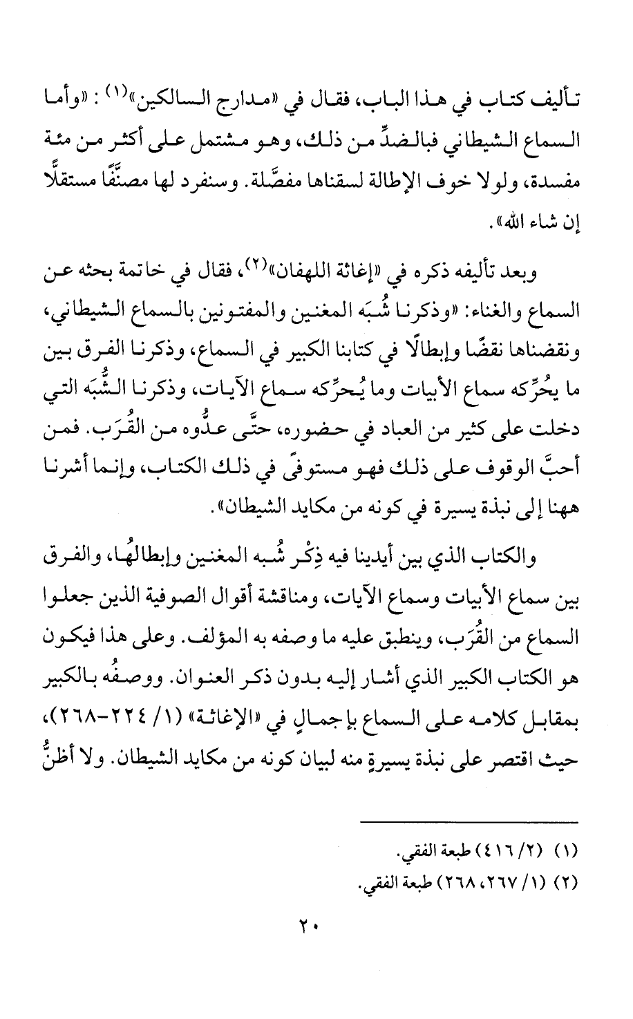 والكتاب الذي بين أيدينا فيه ذِكْر شُبه المغنين وإبطالهُا، والفرق بين سماع الأبيات وسماع الآيات، ومناقشة أقوال الصوفية الذين جعلوا السماع من القُرَب، وينطبق عليه ما وصفه به المؤلف. وعلى هذا فيكون هو الكتاب الكبير الذي أشار إليه بدون ذكر العنوان. ووصفُه بالكبير بمقابل كلامه على السماع بإجمالٍ في "الإغاثة" (1/ 224 - 268)، حيث اقتصر على نبذة يسيرةٍ منه لبيان كونه من مكايد الشيطان. ولا أظنُّ
