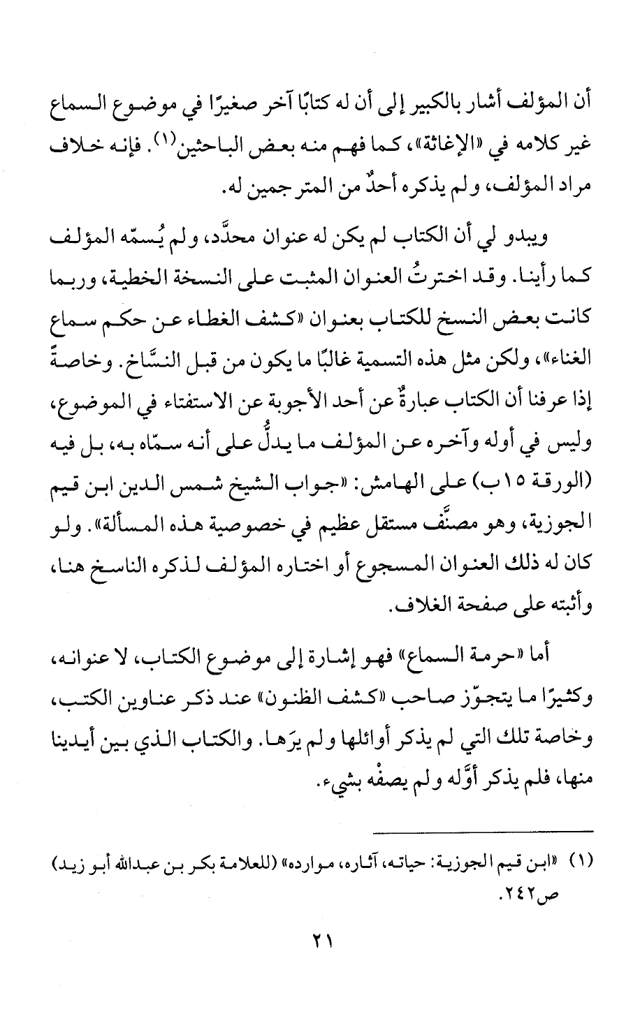 أما "حرمة السماع" فهو إشارة إلى موضوع الكتاب، لا عنوانه، وكثيرًا ما يتجوّز صاحب "كشف الظنون" عند ذكر عناوين الكتب، وخاصة تلك التي لم يذكر أوائلها ولم يرَها. والكتاب الذي بين أيدينا منها، فلم يذكر أوَّله ولم يصفْه بشيء.