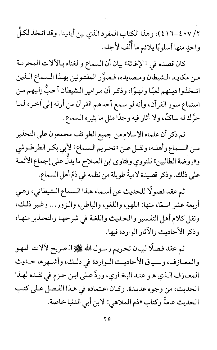 ثم ذكر أن علماء الإسلام من جميع الطوائف مجمعون على التحذير من السماع وأهله، ونقل عن "تحريم السماع" لأبي بكر الطرطوشي و"روضة الطالبين" للنووي وفتاوى ابن الصلاح ما يدلُّ على إجماع الأئمة على ذلك. وذكر قصيدة لاميةً طويلة من نظمه في ذمّ أهل السماع.